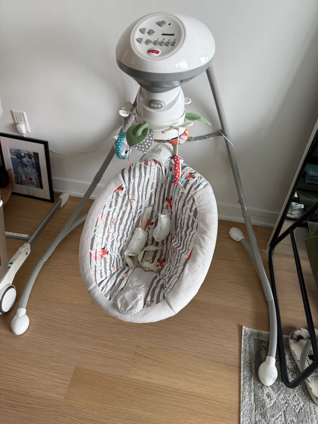 Selling a Fisher-Price baby swing in great condition! It features a variety of settings and sounds to soothe your little one. Perfect for newborns up to a few months old, depending on their size and development. It has a comfortable seat and overhead mobile to keep your baby entertained. We used it from day 0 until now and our daughter is 9months old !