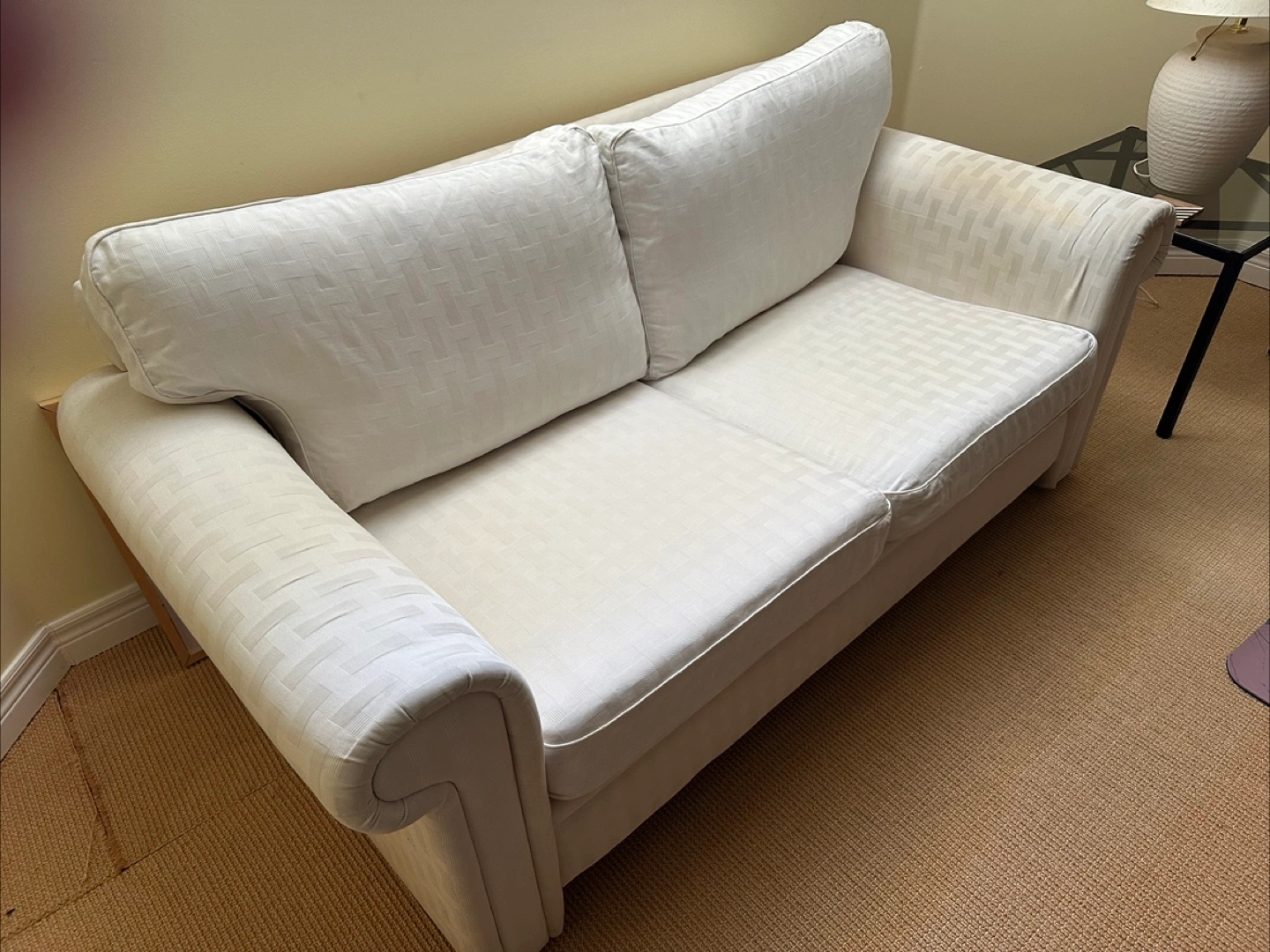 Selling a loveseat sofa in a lovely cream colour. The dimensions are 68” (width) x 30” (height of the backrest). It's in fairly good condition and would be a perfect addition to any living space! Covers of the cushions are washable.