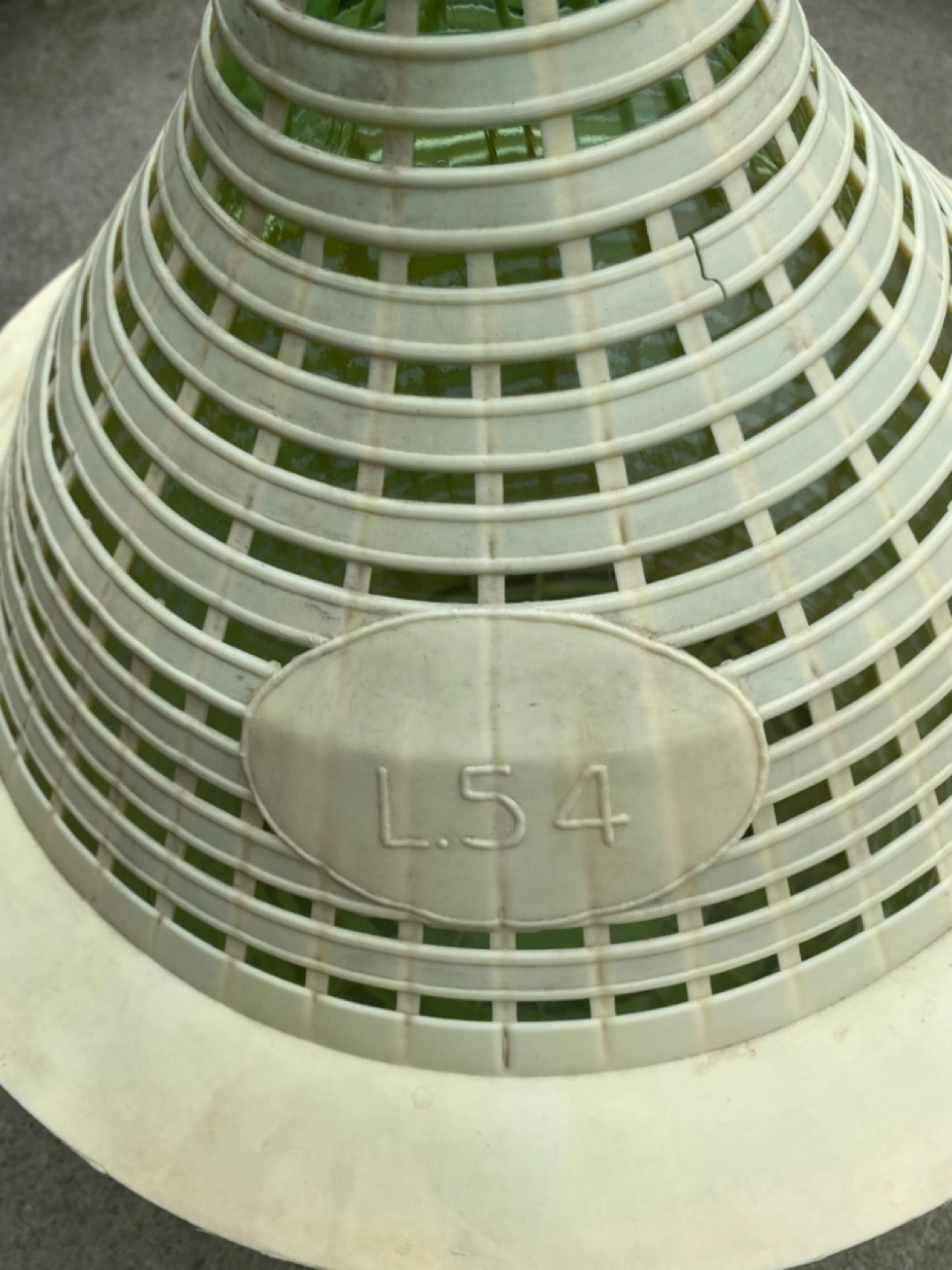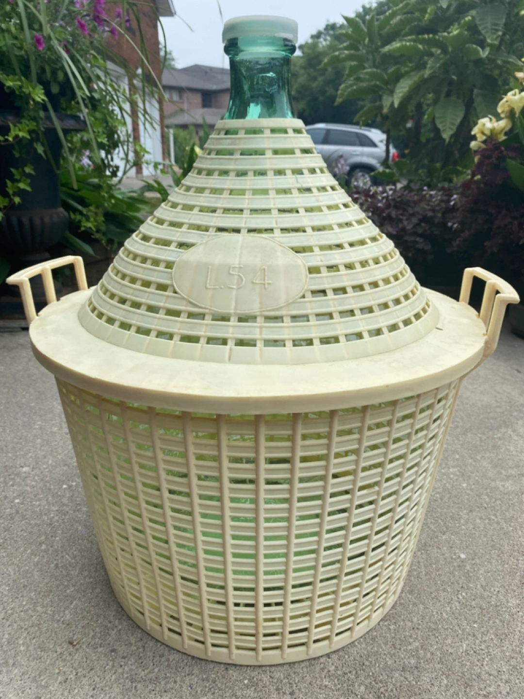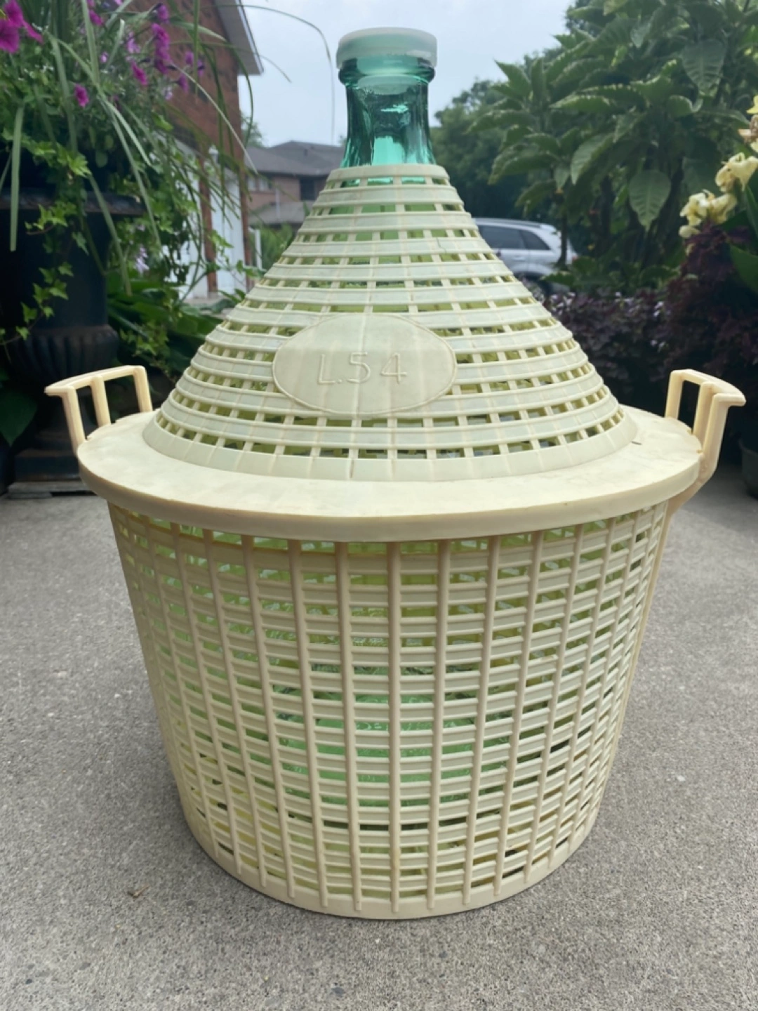 Selling a vintage demijohn carboy bottle, marked with L.54. It's in good condition and comes with the protective plastic basket. Perfect for wine making or as a decorative piece!