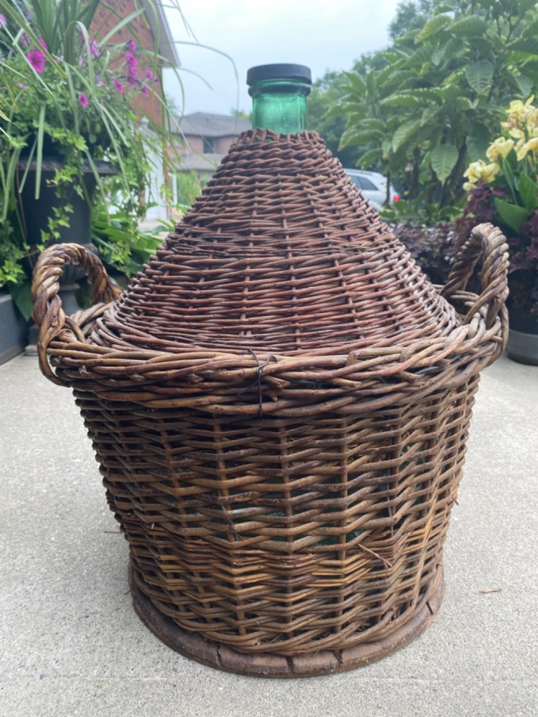 Selling a wicker-covered demijohn bottle! It's in good condition and would make a lovely decorative piece for your home or garden