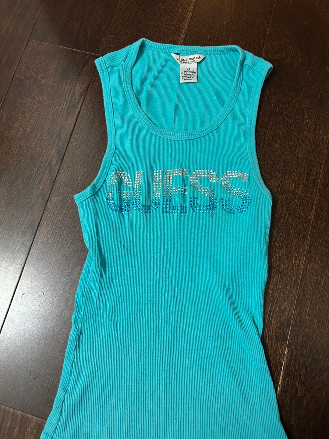 Cute Guess Jeans tank top in a vibrant turquoise colour! It's a size XS and features the Guess logo in sparkly rhinestones. Perfect for a casual summer look!