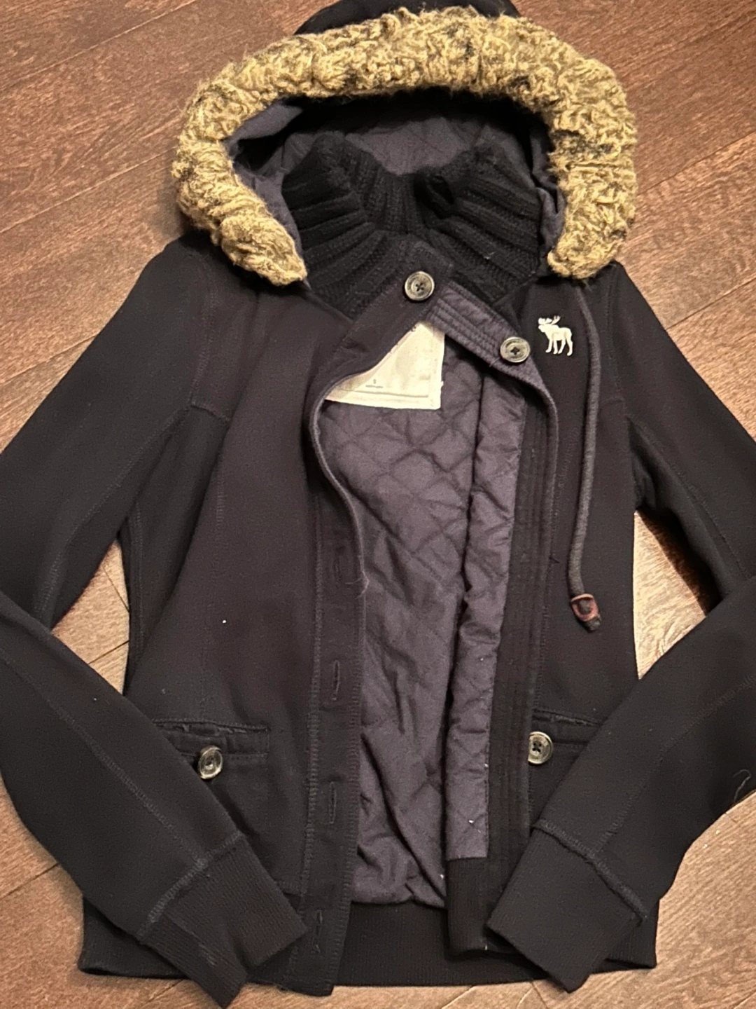 Cozy black Abercrombie & Fitch jacket with a faux fur-trimmed hood! It's in great condition and features a quilted lining and the classic A&F moose logo