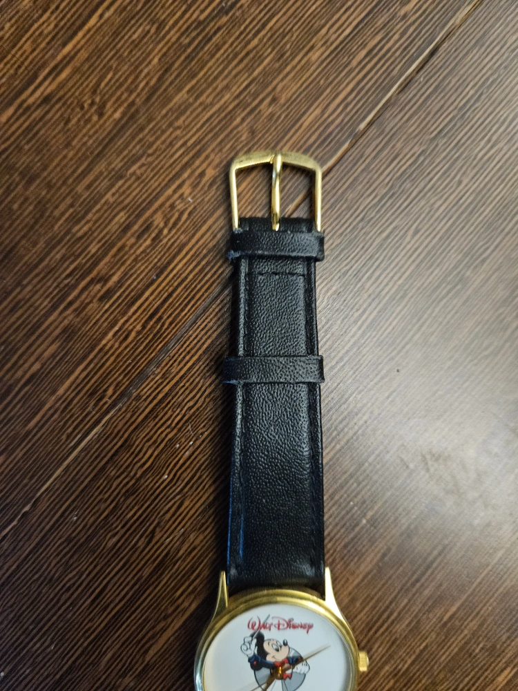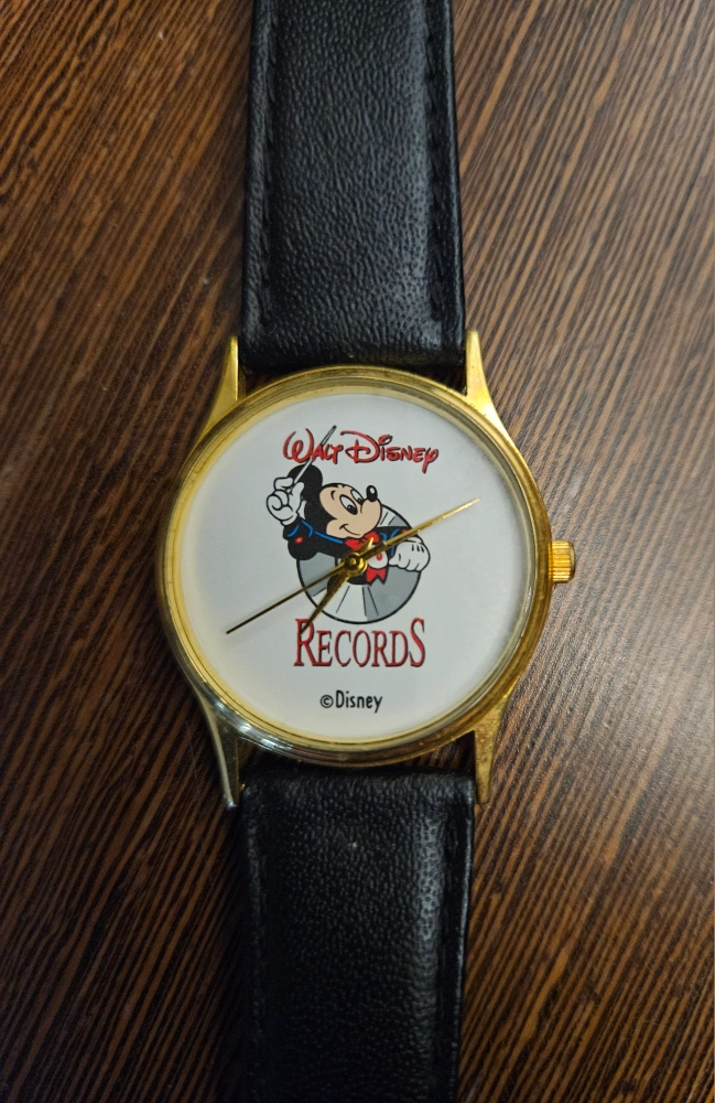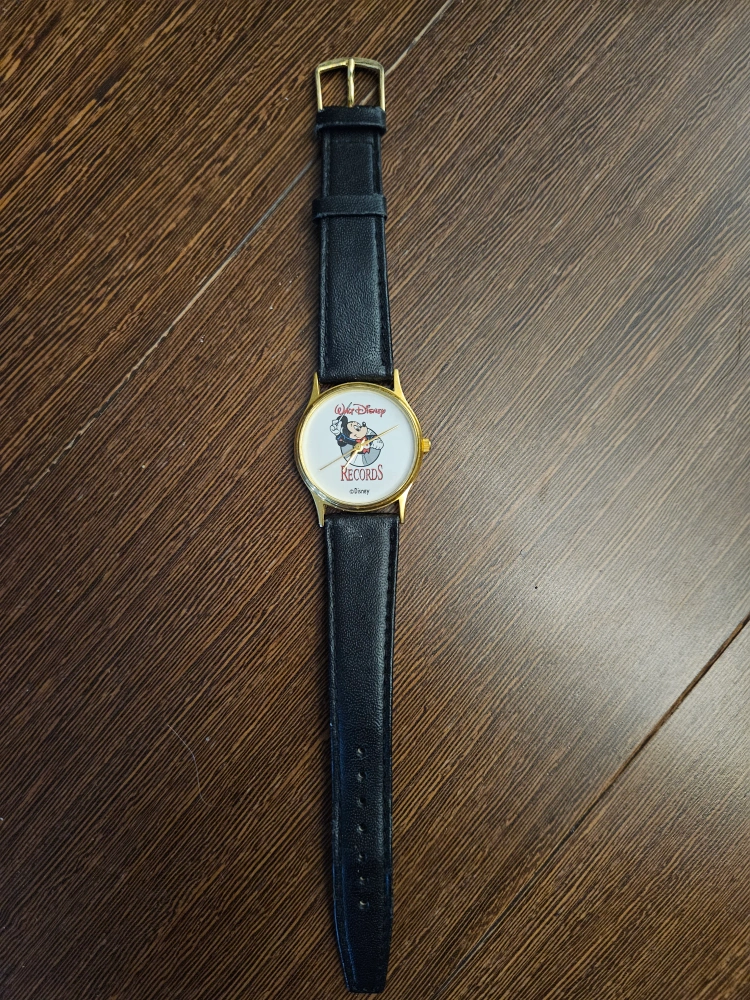 708Walt Disney Records Watch. Features Mickey Mouse! Gold-tone case, black leather strap. It's in good used condition. Needs new battery. Fun addition to any Disney collection. Located King St W and Dufferin St. See my other listings.