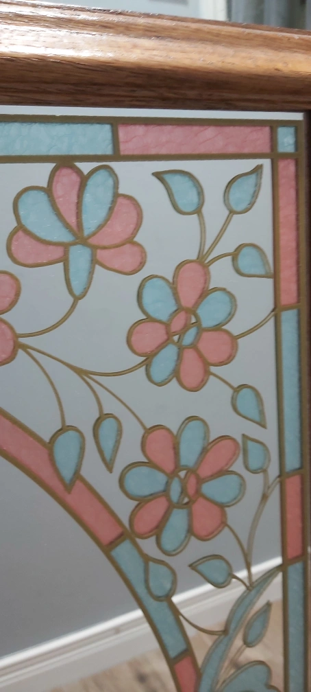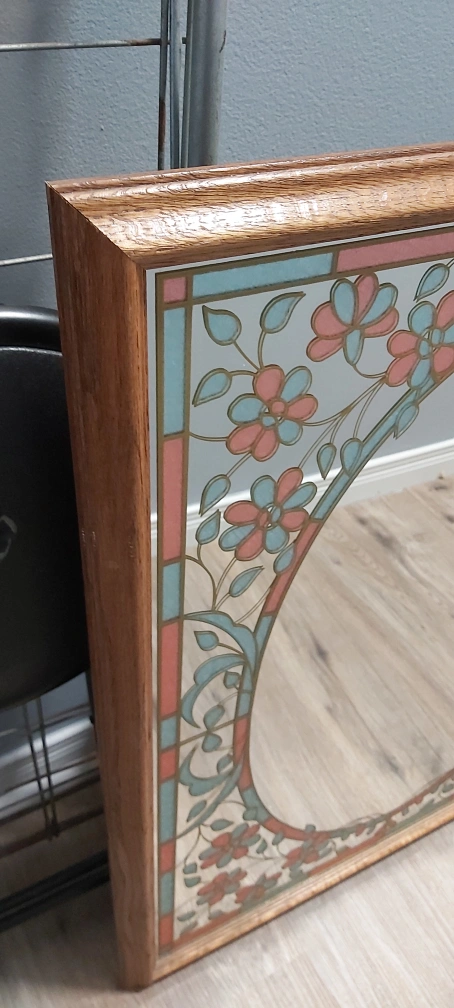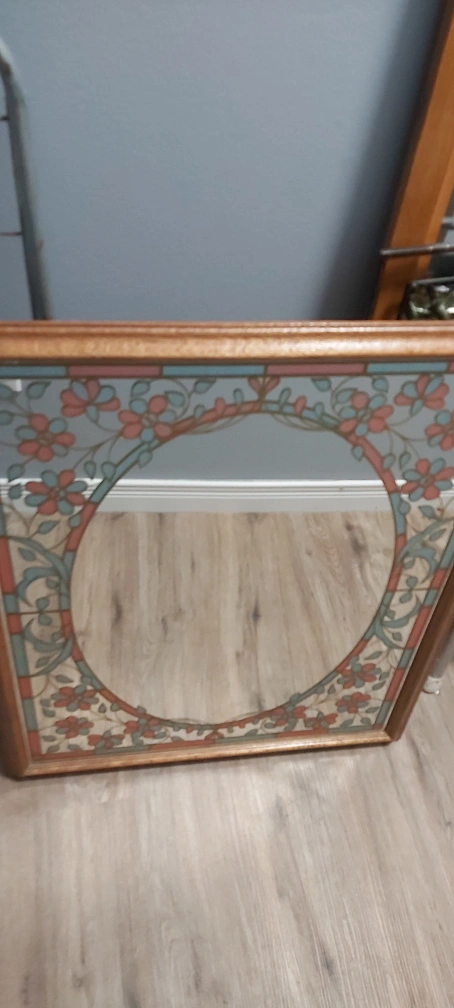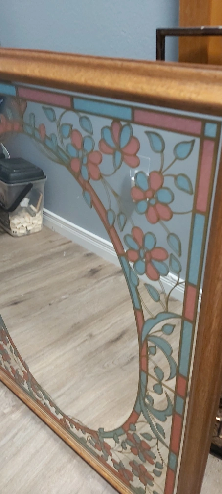 Beautiful mirror with pink and blue highlights. Don't know if this is etched on or not. Doesn't look like its just painted. It is vintage though. Pick up in Walkerville
