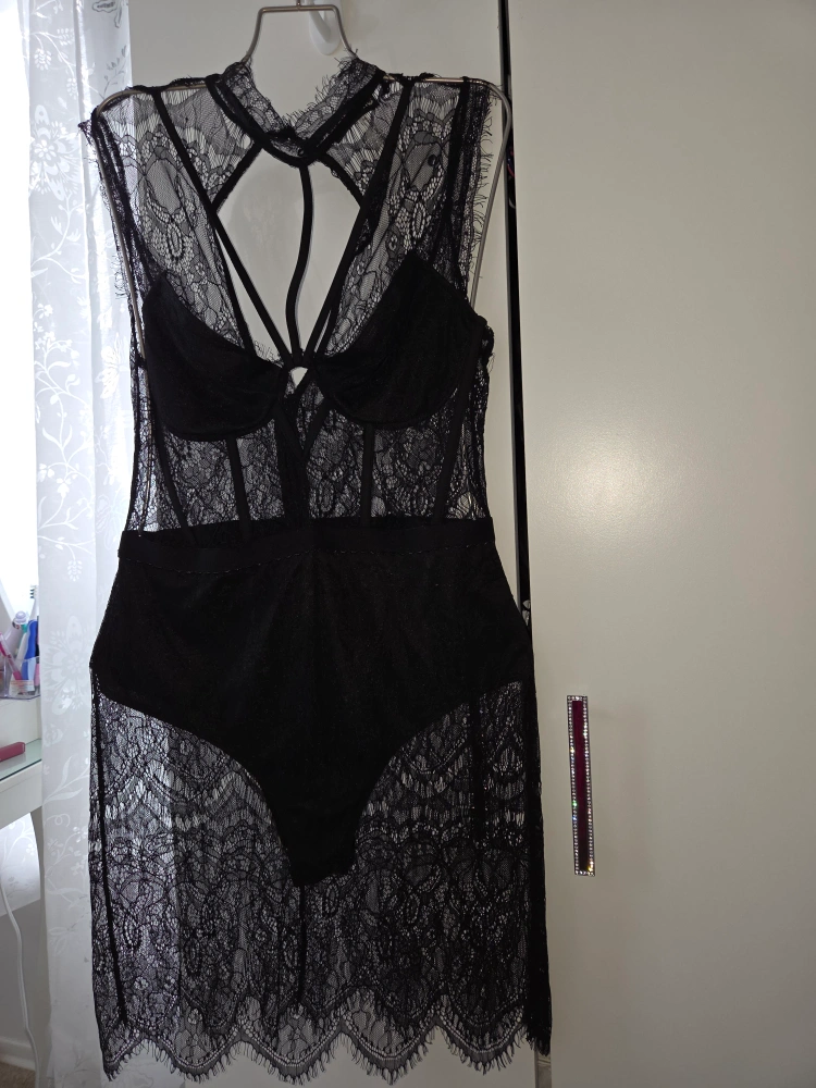 black lace bodysuit This piece features a delicate lace design and a flattering fit. It's in great condition and ready for a new home!