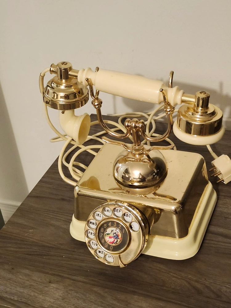 Selling a vintage rotary French style dial telephone with a unique gold finish. It has a classic design and would make a great decorative piece or functional phone for someone who appreciates retro style. It's in good condition!