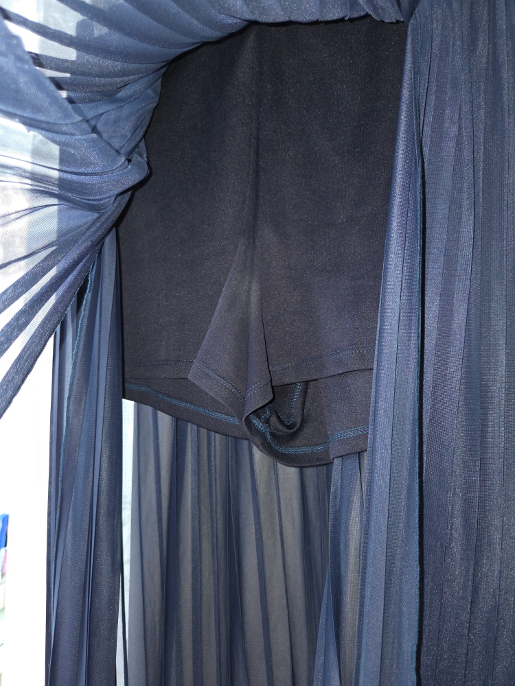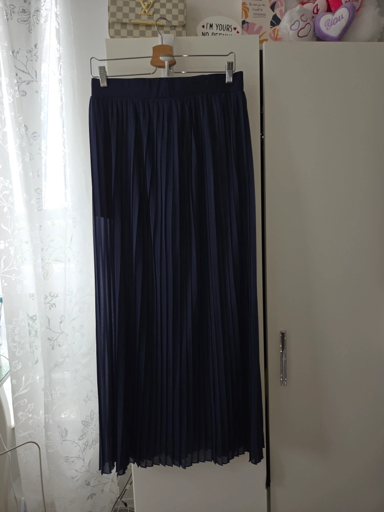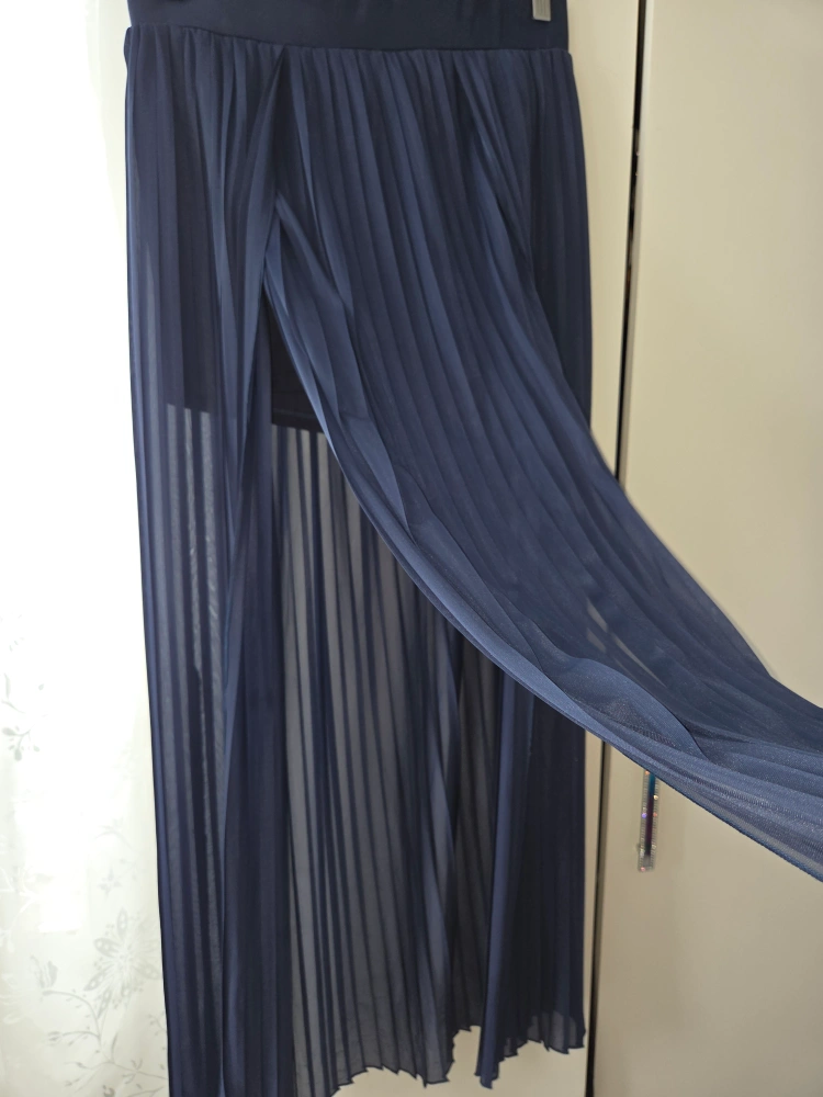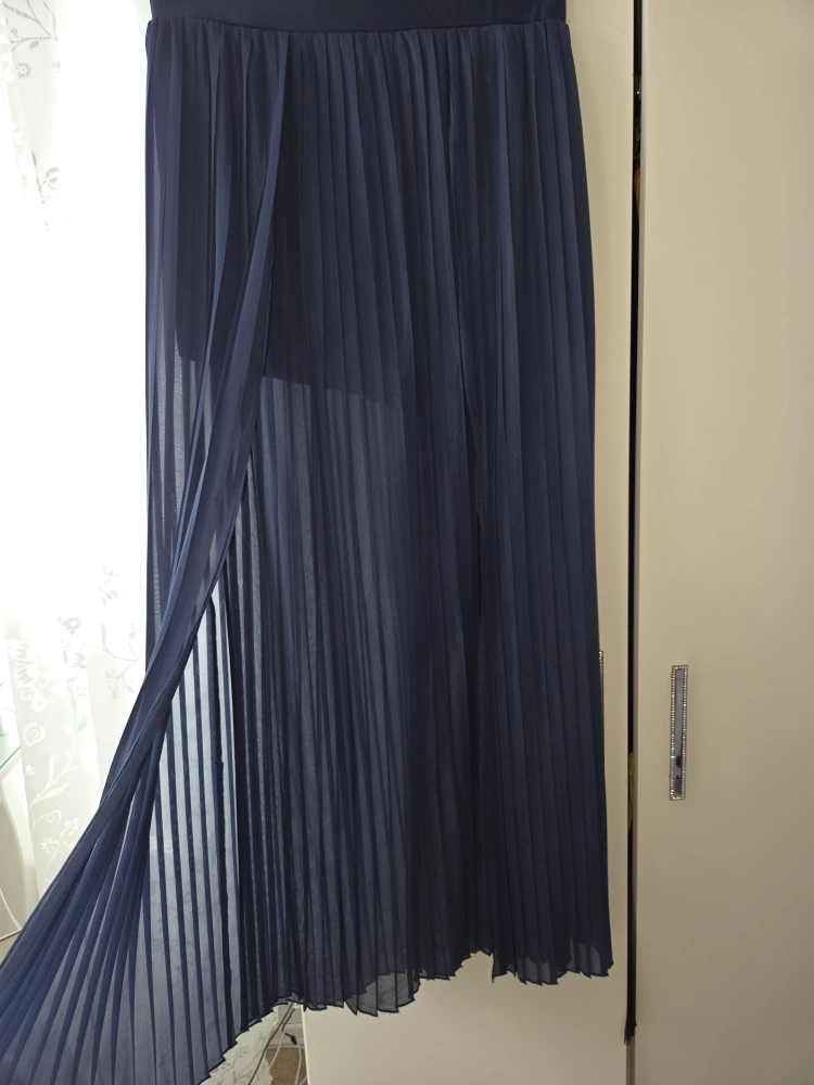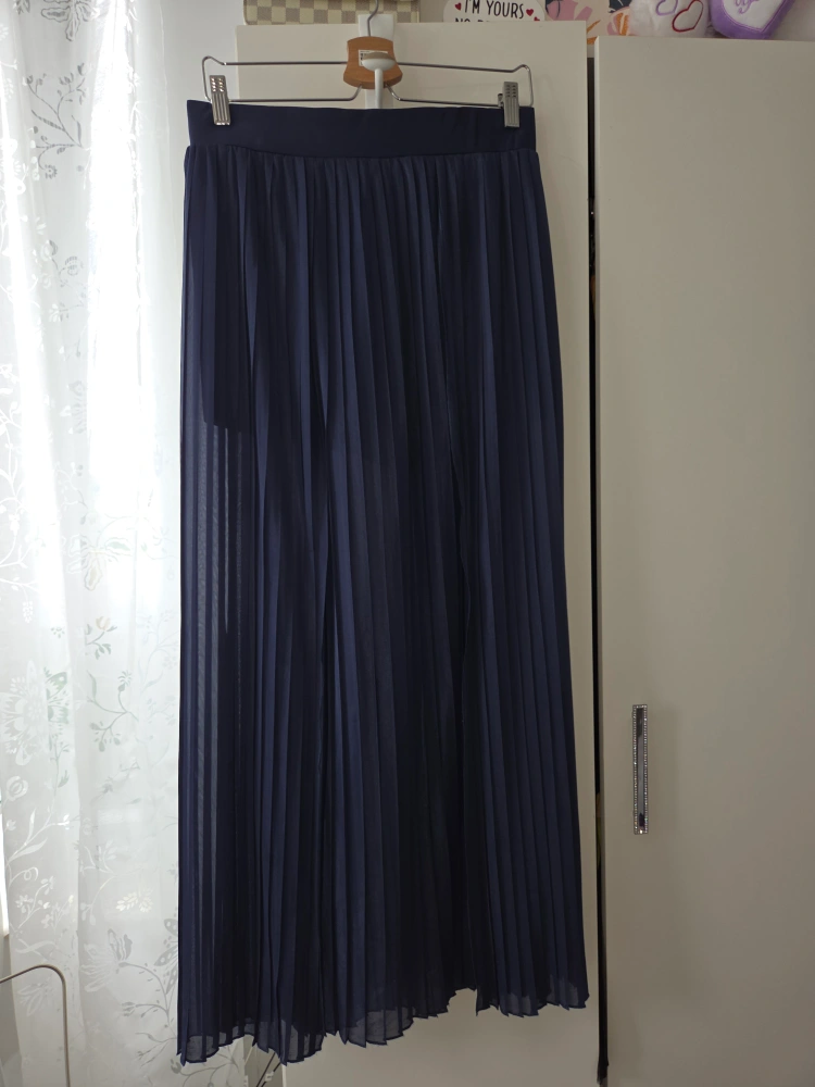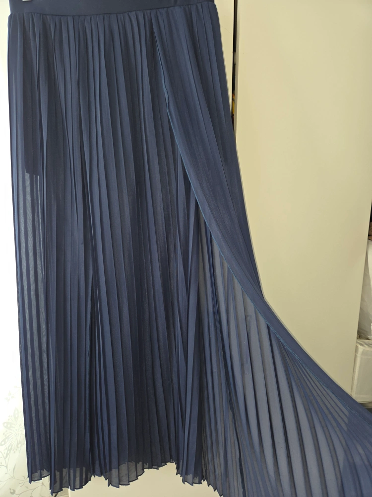 Here's a flowy navy blue pleated maxi skirt. It has a built-in shorts lining, making it super comfy and practical. Perfect for dressing up or down!