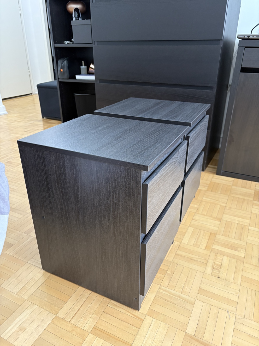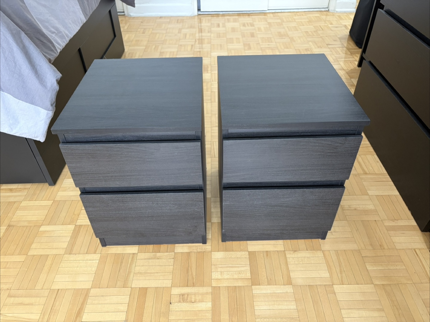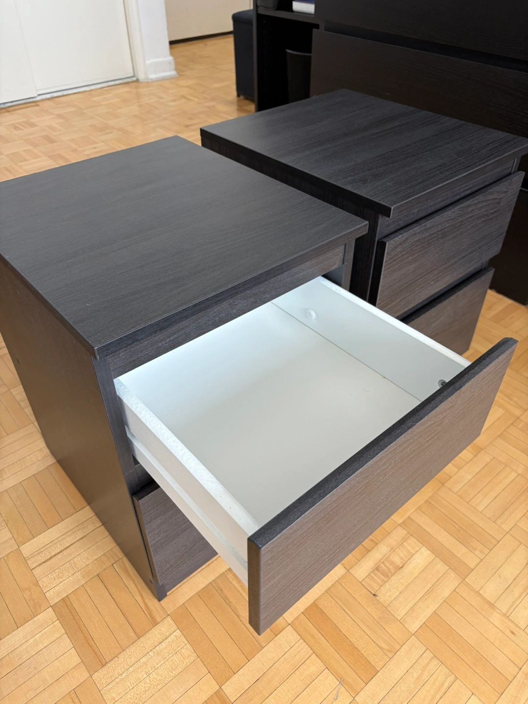 Selling a pair of IKEA Malm nightstands in black-brown. They're in great shape and ready for a new home!