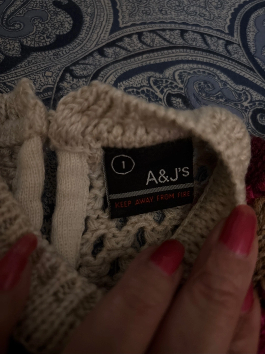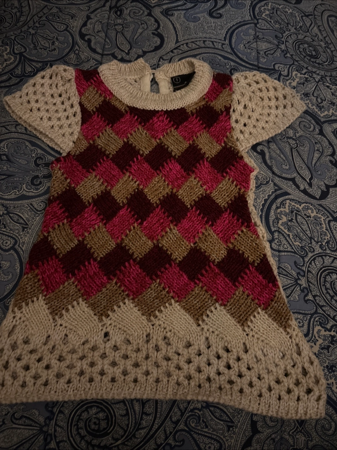 Selling a cute knit dress from A&J's! It features a unique diamond pattern in shades of cream, brown, and pink. The dress is size 1 and has a lovely crocheted texture. Perfect for a stylish little one!