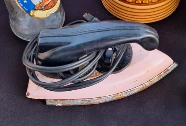 Pink metal vintage 1965 toy iron with cord. Still works. Some rust. Not recommended for kids nowadays, will burn.