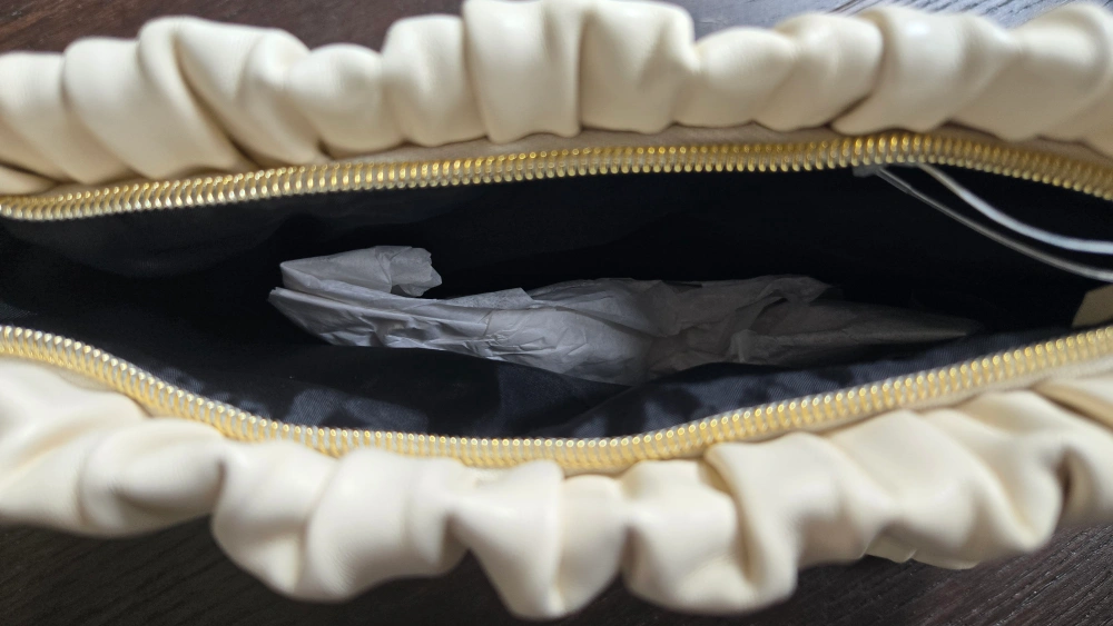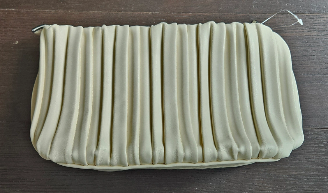 Selling a cute cream-colored ruched clutch from Victoria's Secret! It's brand new, never been used. The bag features a gold VS logo and a zipper closure.