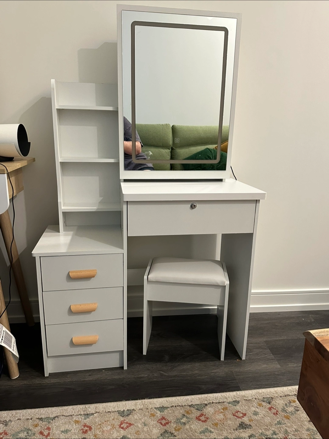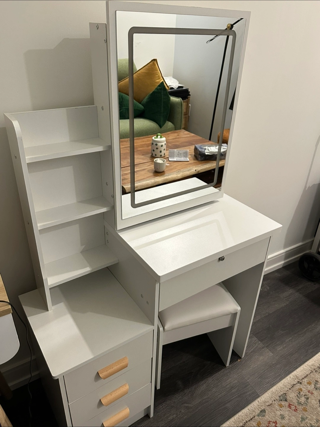 Selling a white vanity table with a lighted mirror. It features a built-in mirror with lights that slides open to reveal more storage, drawers, and a small stool. Brand new just put together but doesn’t fit the space right! Pick up only
