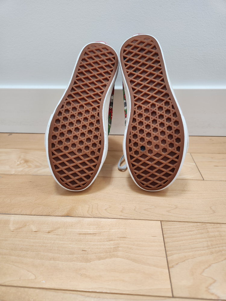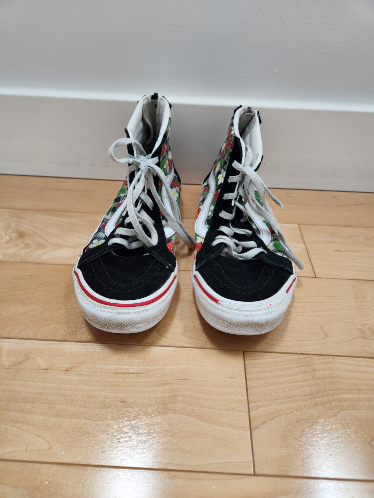 Selling a pair of vans strawberry gingham sk8-hi zip sneakers/shoes - size 2.5 (youth) in good condition. High-top paneled canvas and suede sneakers in black with strawberry gingham pattern. Comes from a smoke and pet free home.