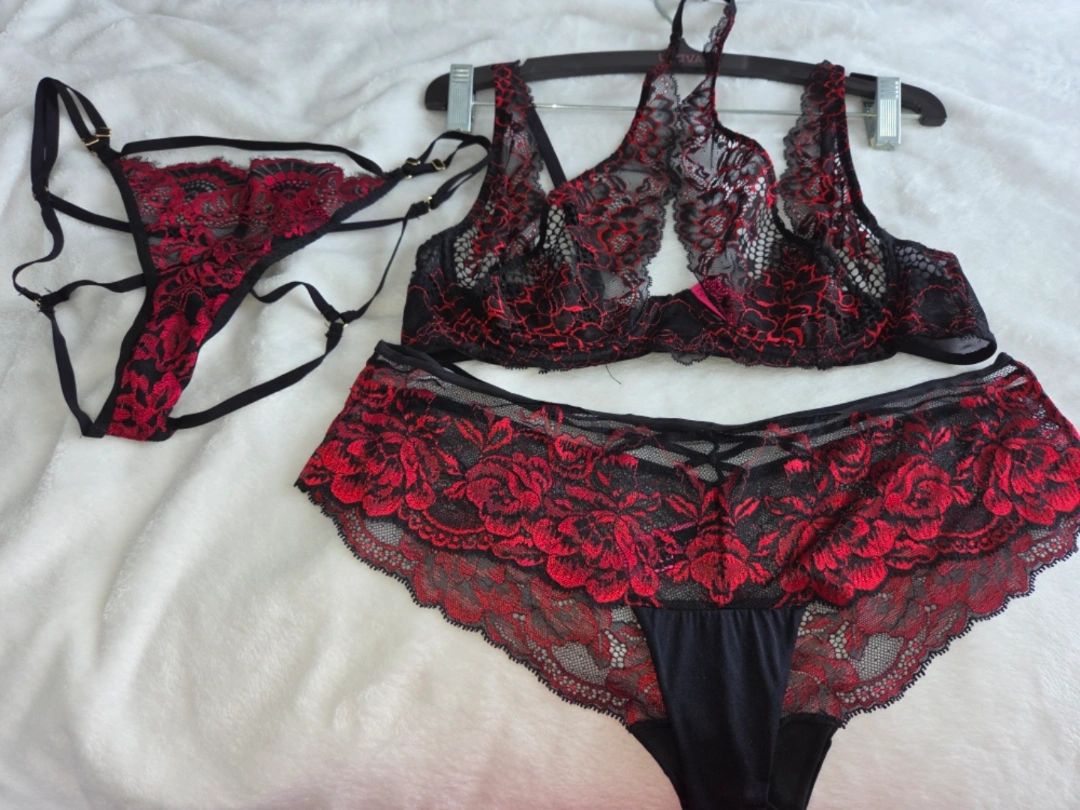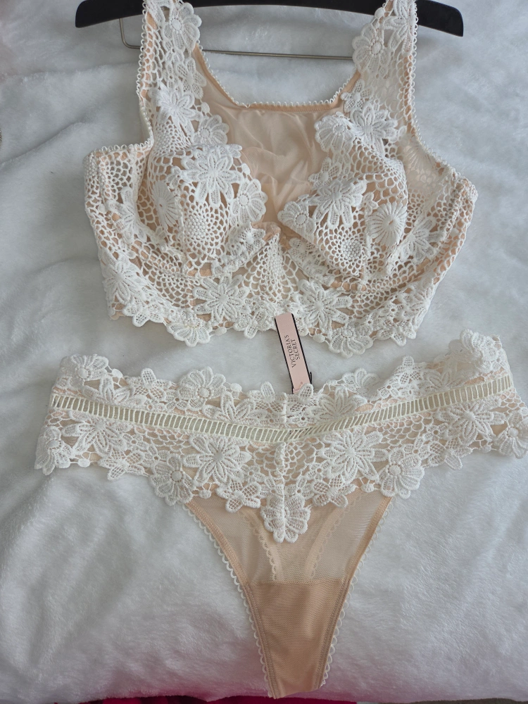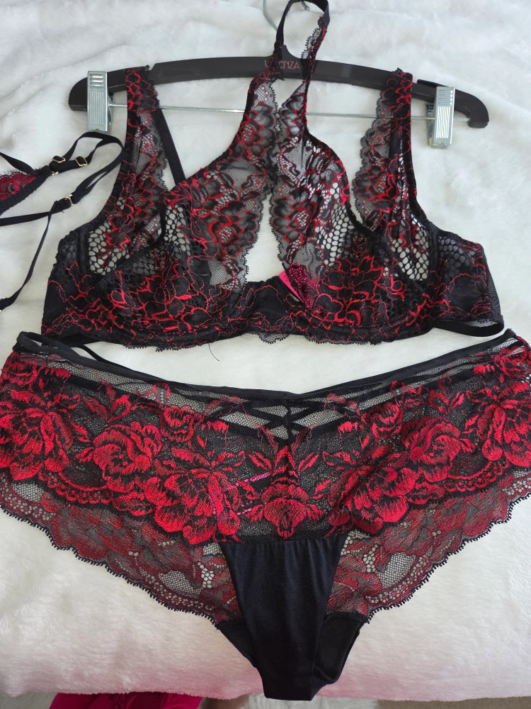 Selling a couple of Victoria's Secret lingerie sets. The first is a beautiful cream-coloured set with lace detailing. The second is a striking black and red lace set. Both are in great condition and ready for a new home!