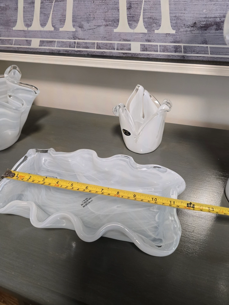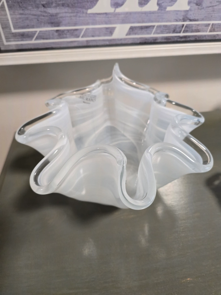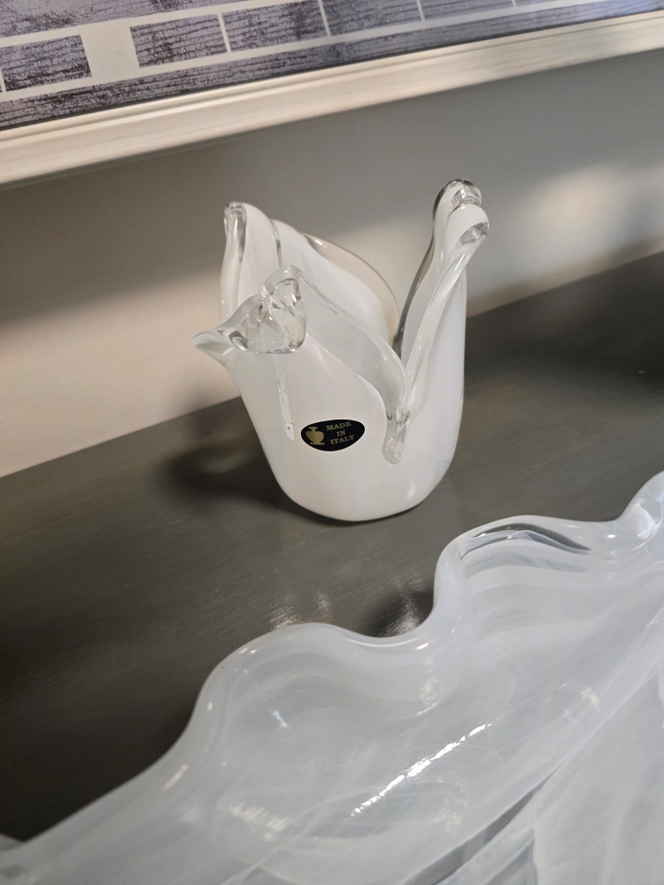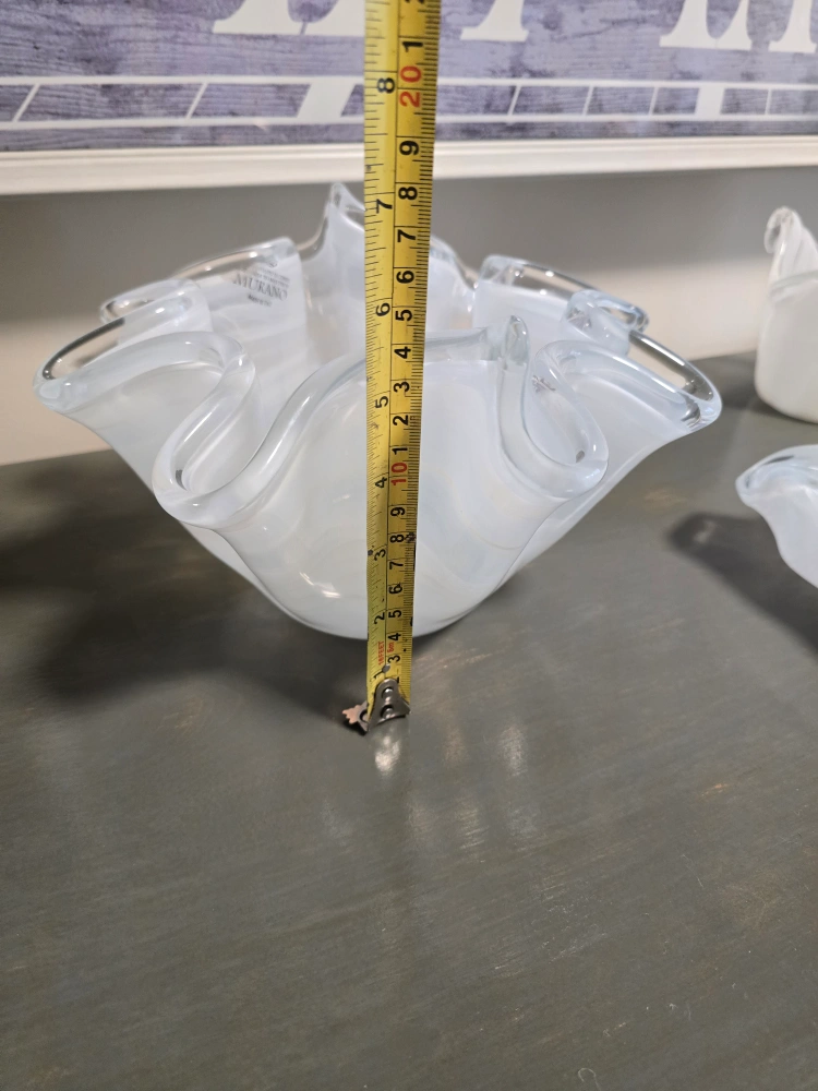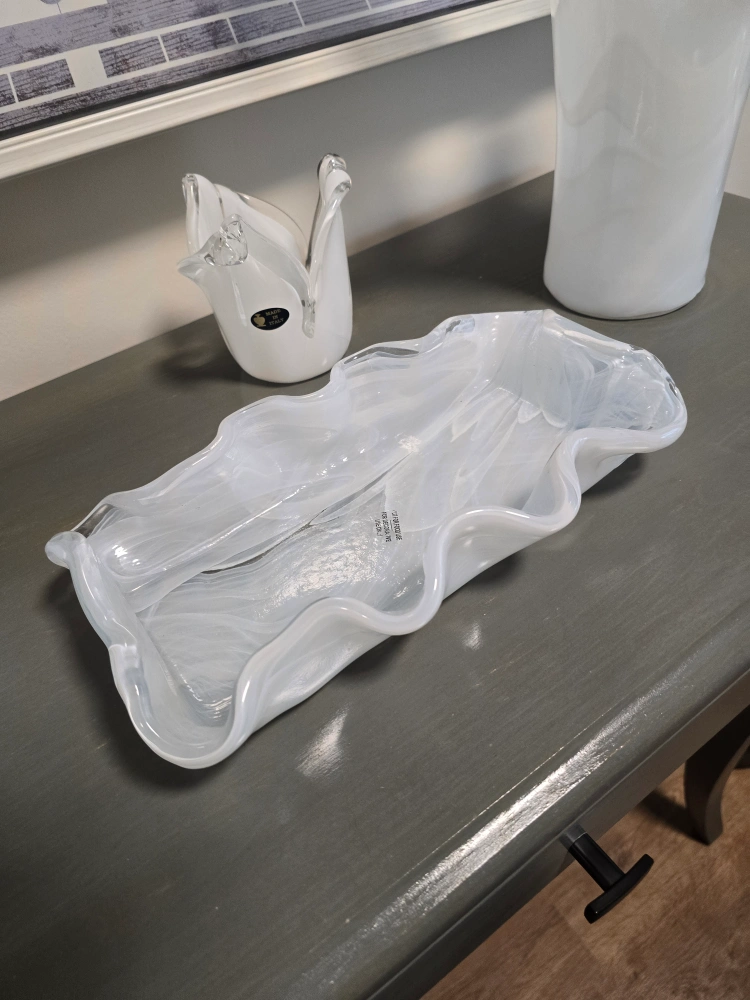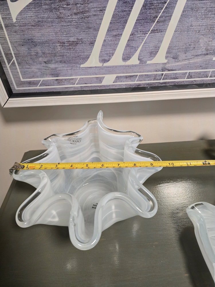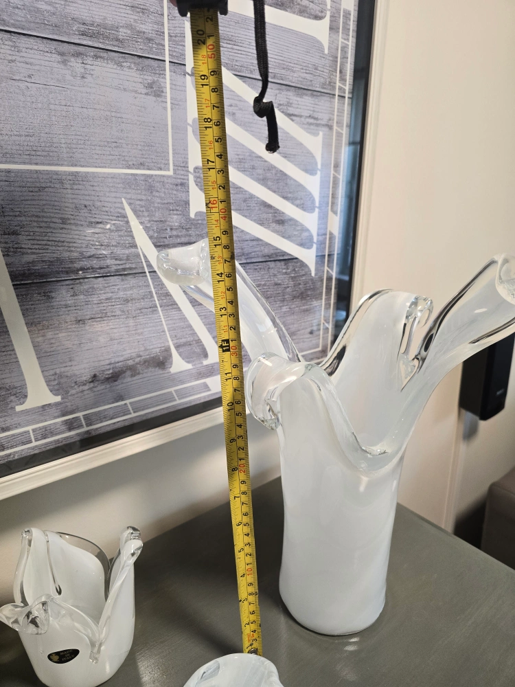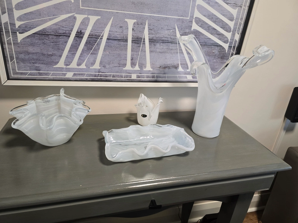 472Selling a beautiful set of Murano glass items! Includes a tall vase, a smaller vase, and a decorative bowl. All pieces are in excellent condition and would make a lovely addition to any home pick up only Cash only see my other posts