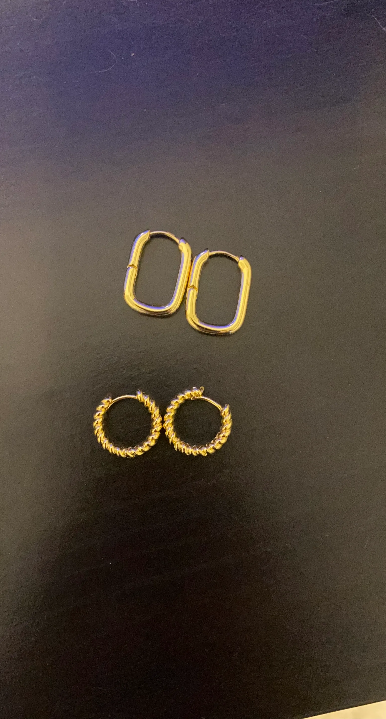 Selling two pairs of gold-coloured hoop earrings. One pair is a twisted rope design, and the other is a rectangular shape. Never used.