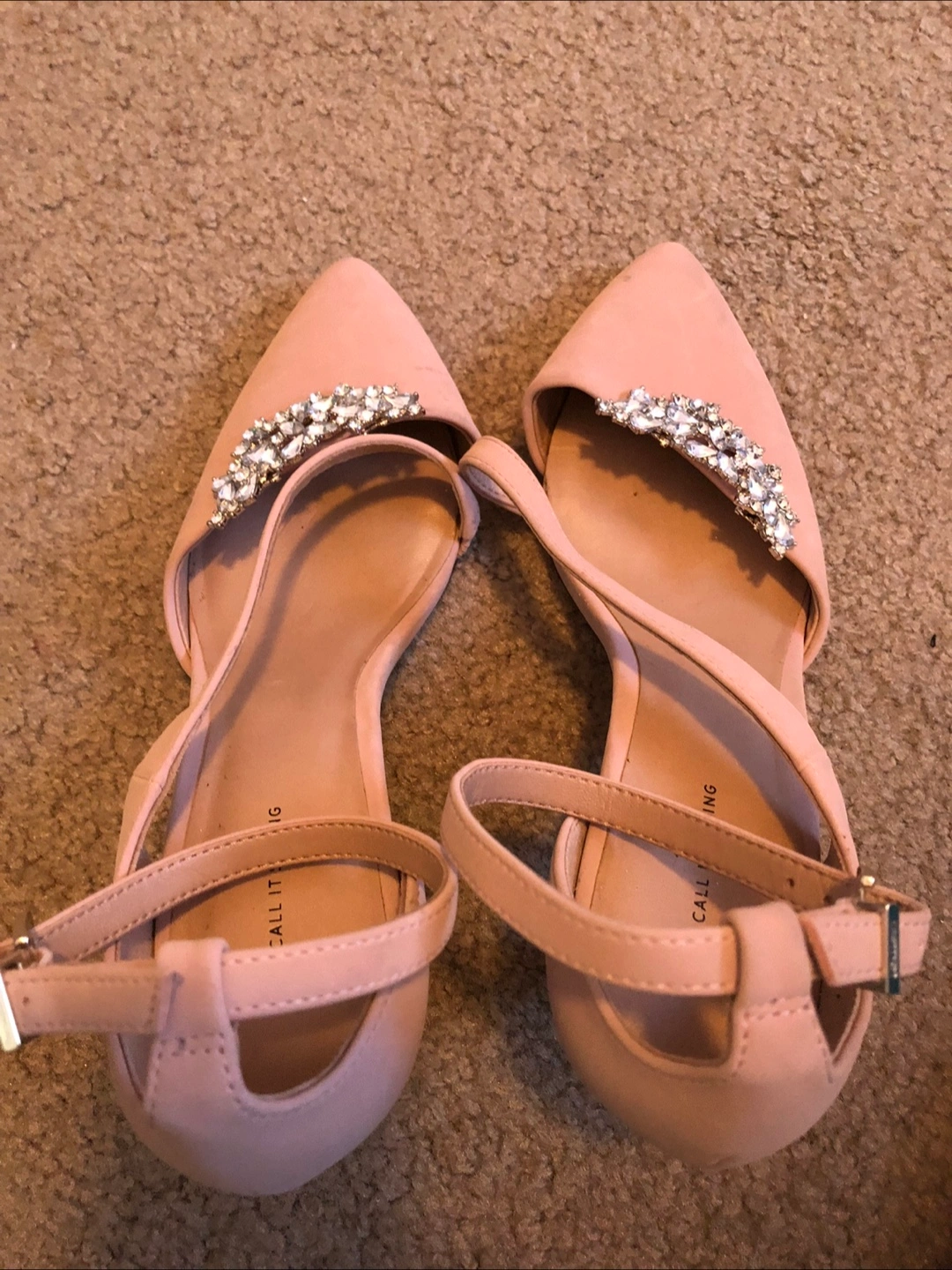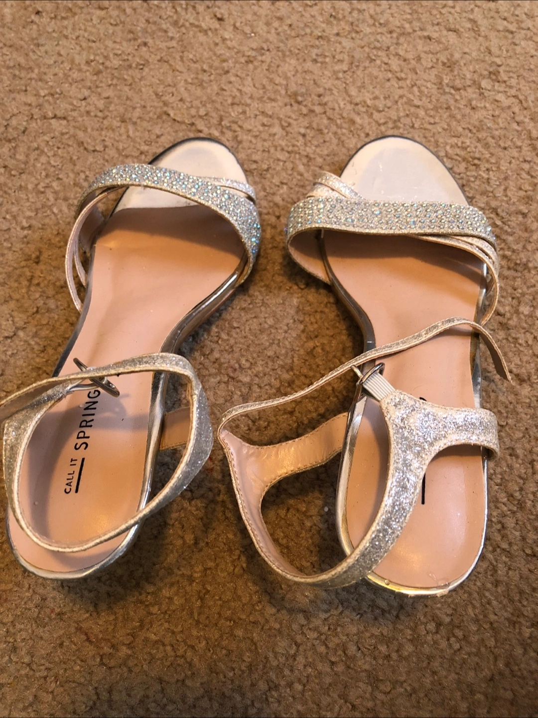 Selling a pair of Call It Spring heels in size 7. They're in used condition, but still have lots of life left! One pair is silver and sparkly, while the other is a light pink with rhinestone details