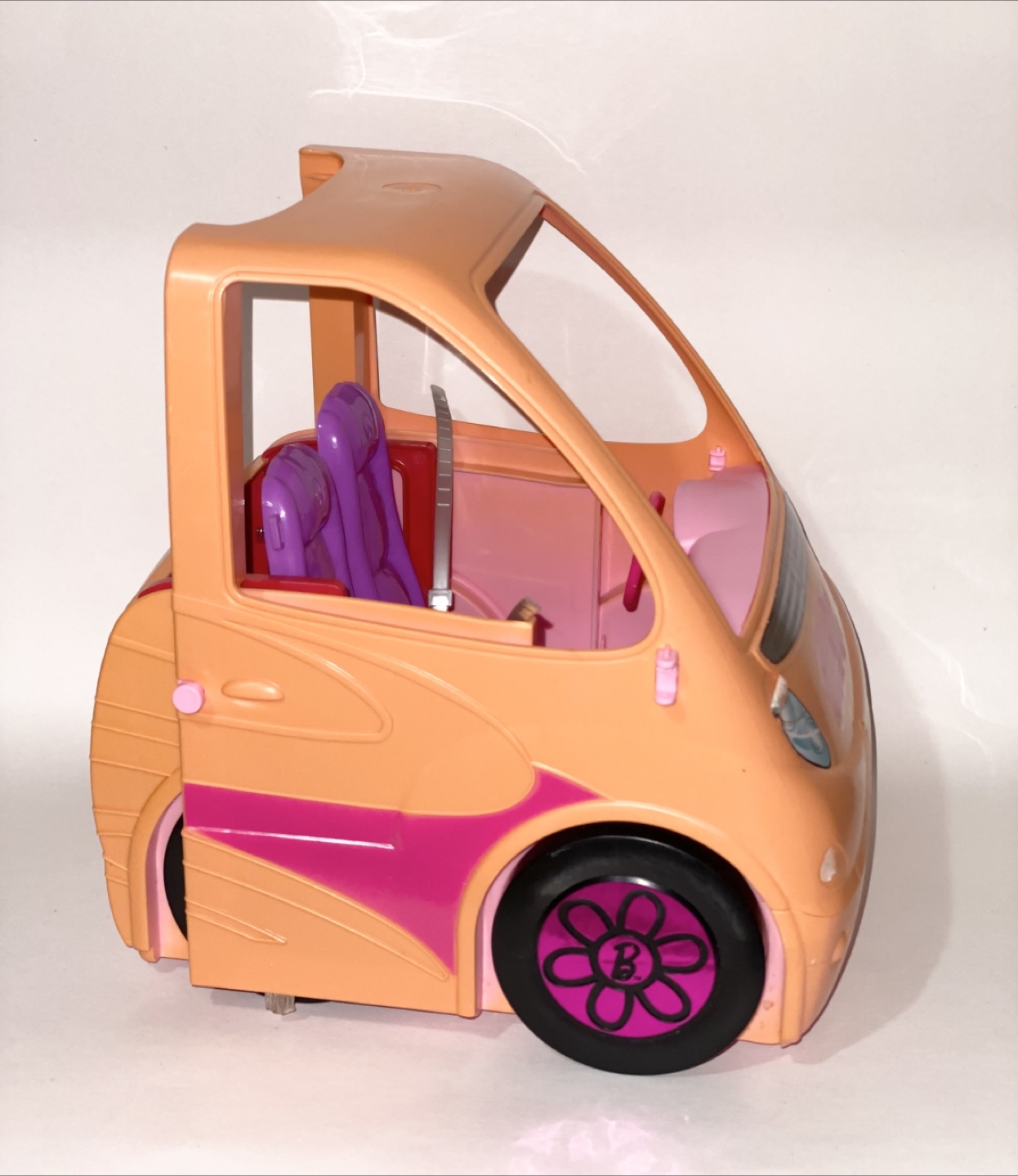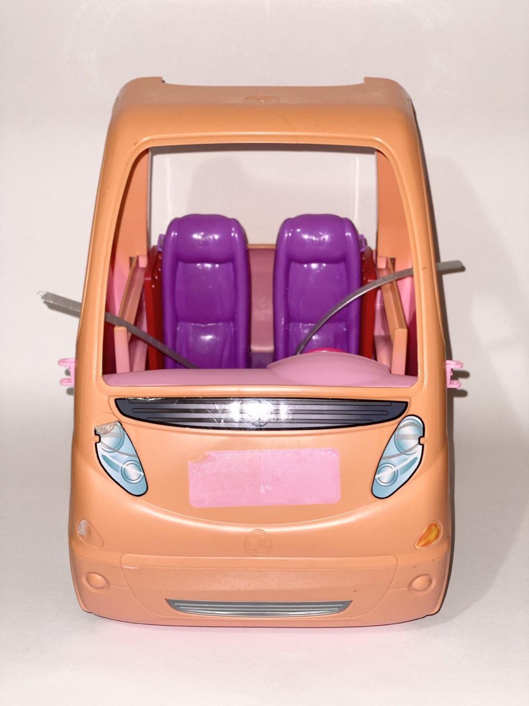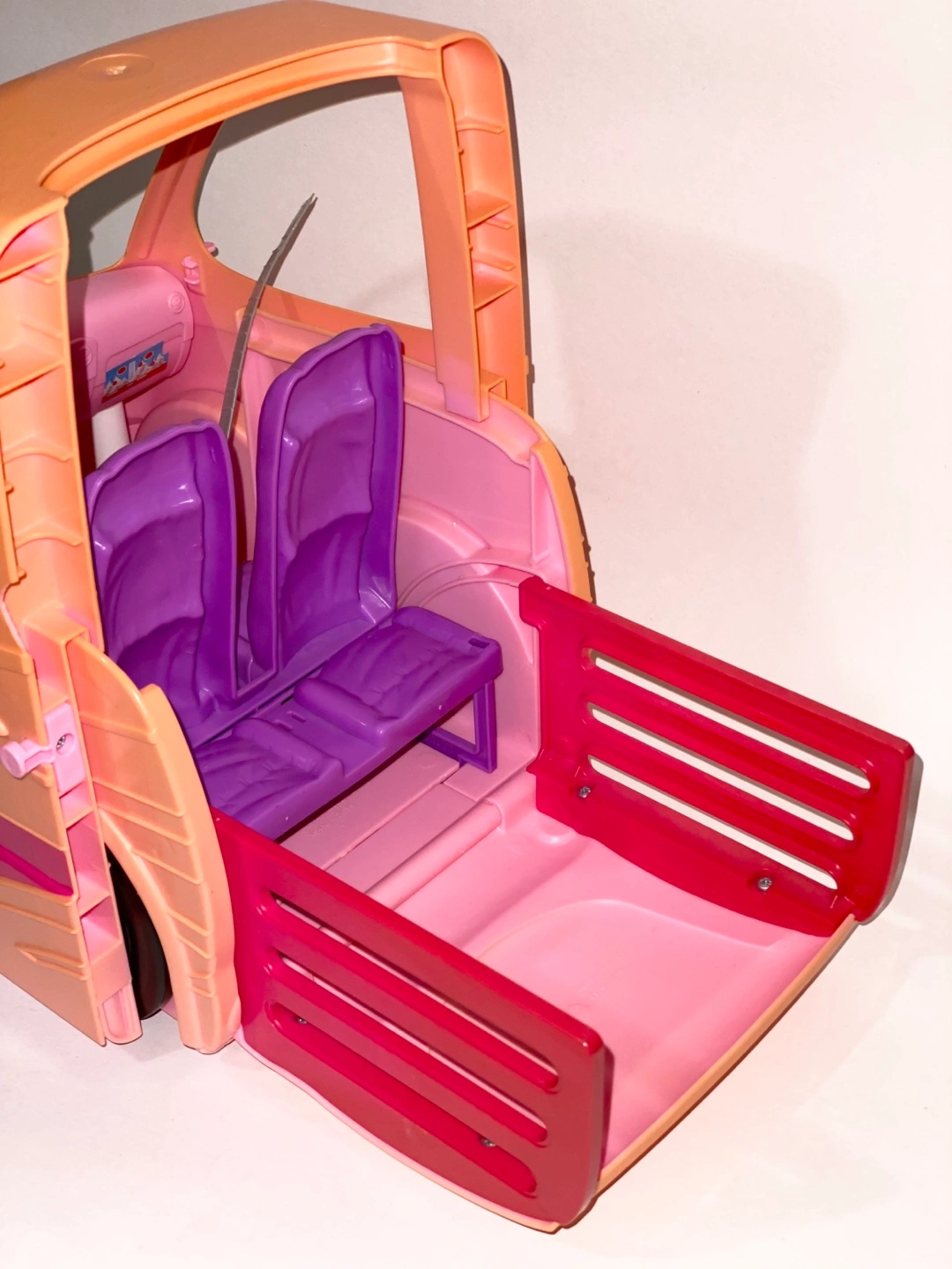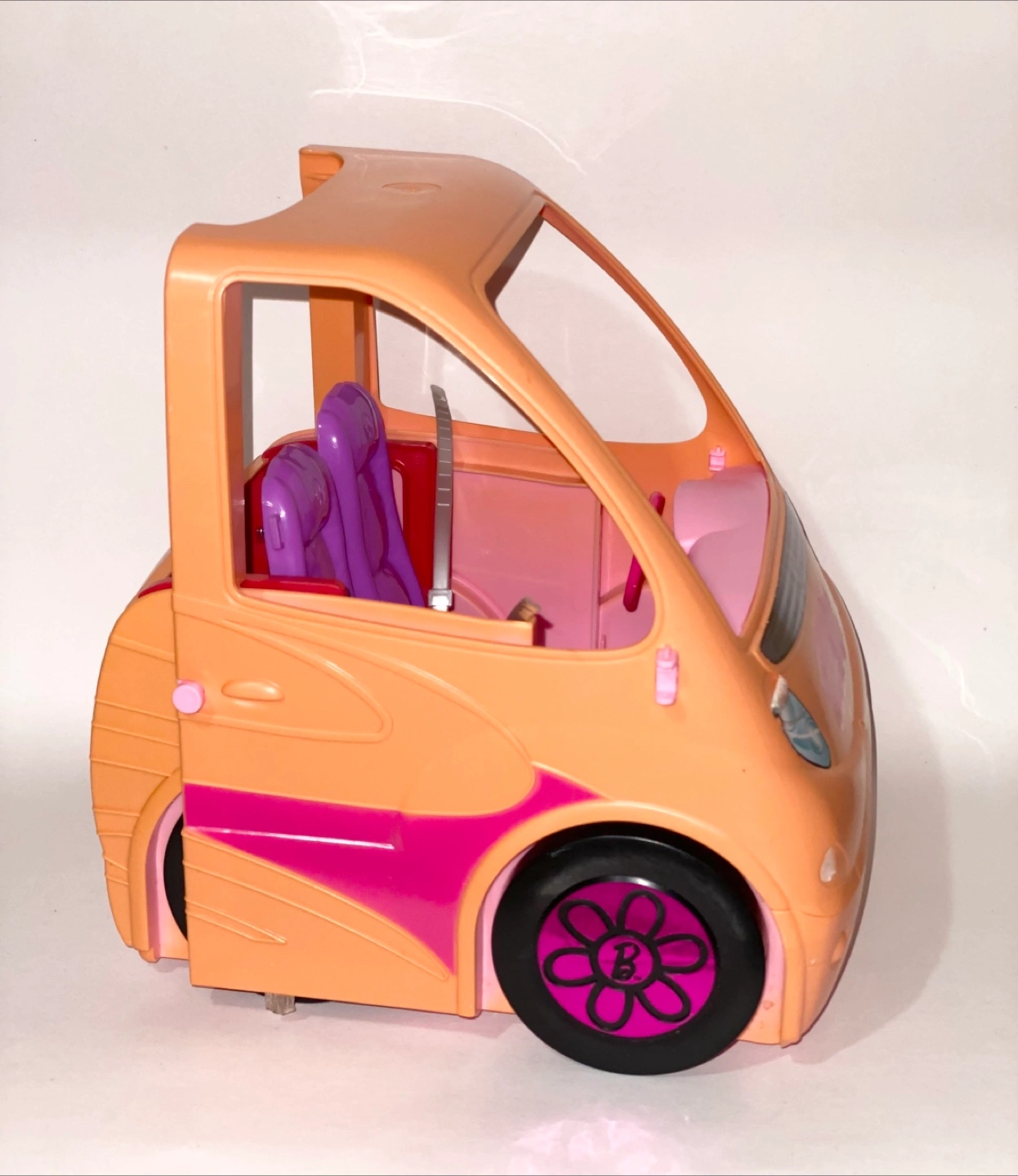 Selling a Barbie camper for parts only. It features purple seats and black wheels with the Barbie logo. Perfect for your Barbie dolls to cruise around in style.