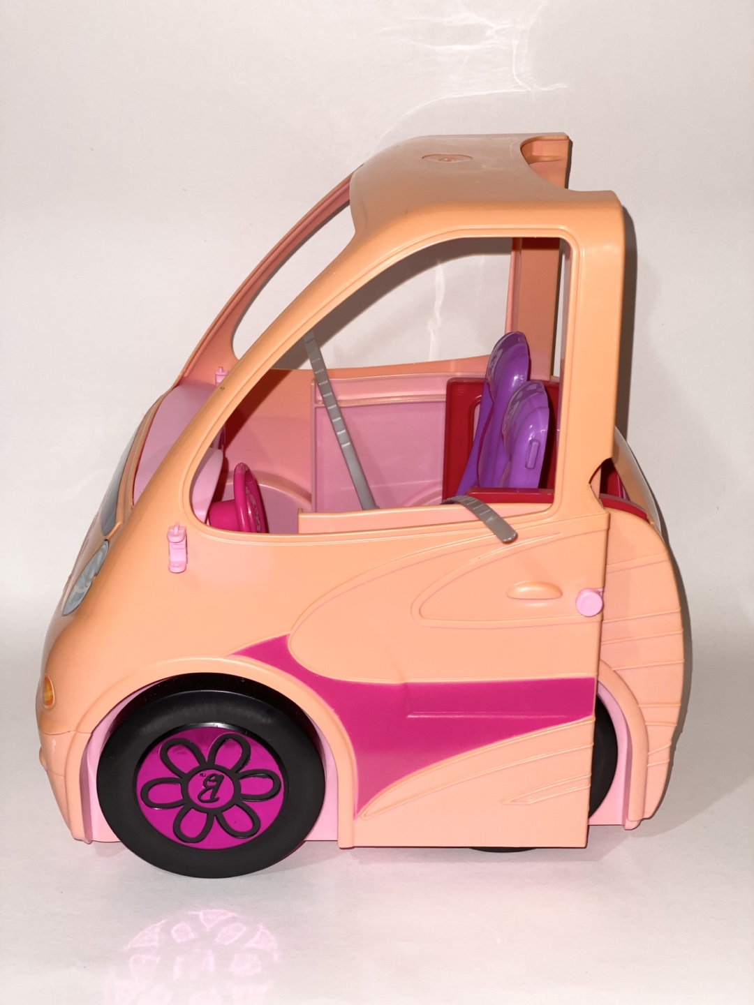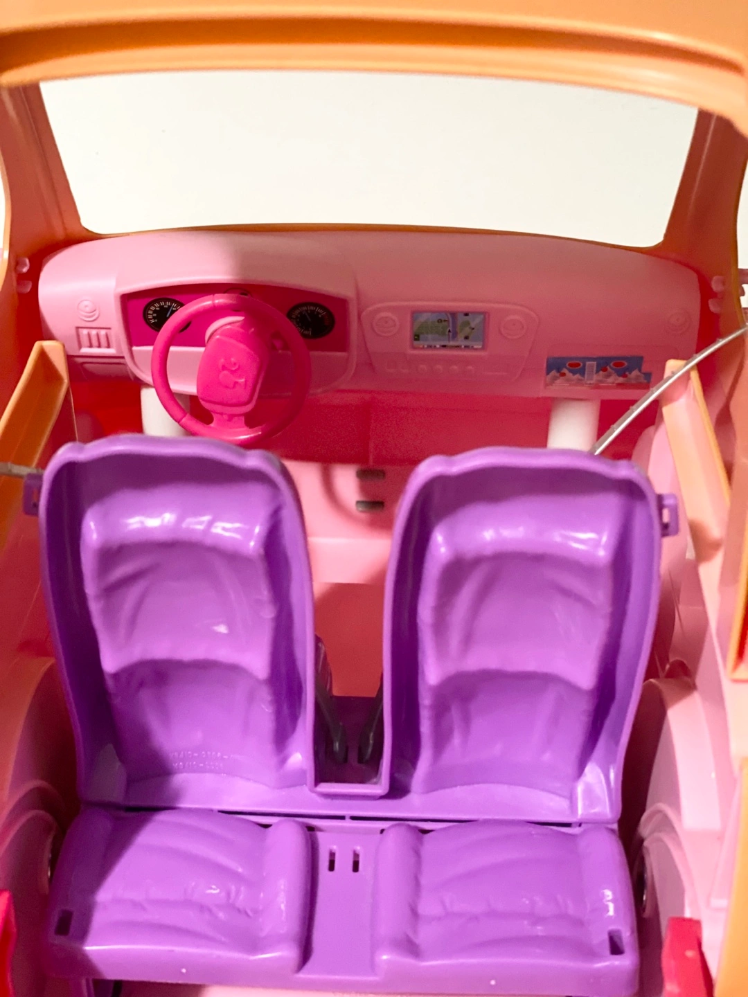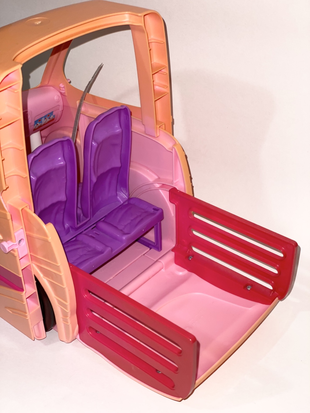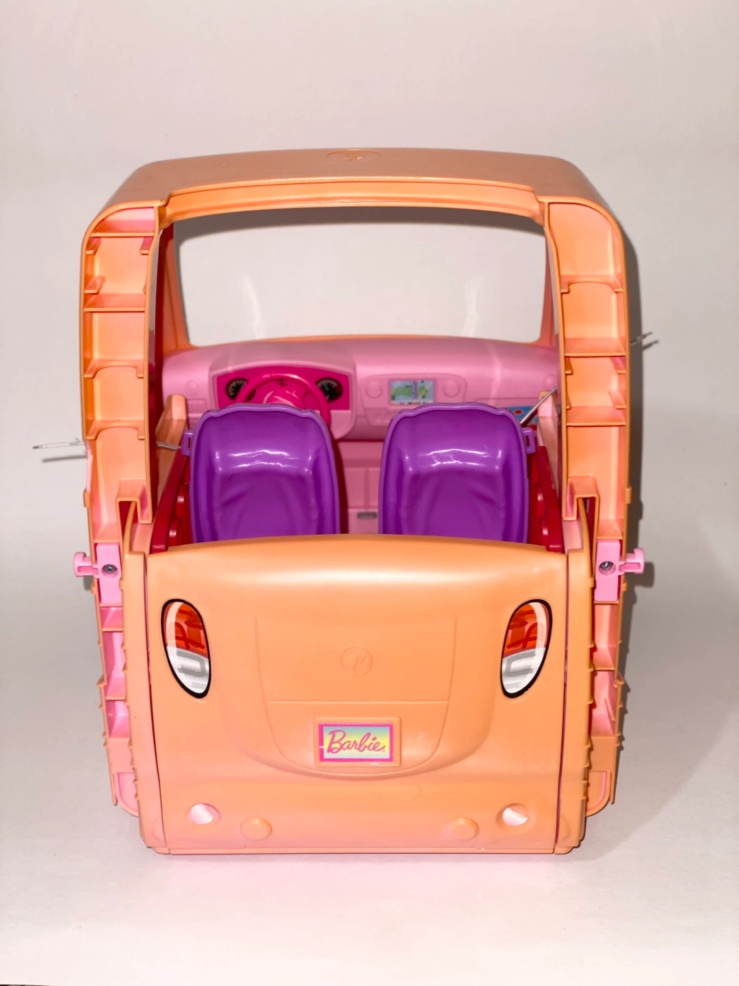 Selling a Barbie camper for parts only. It features purple seats and black wheels with the Barbie logo. Perfect for your Barbie dolls to cruise around in style.