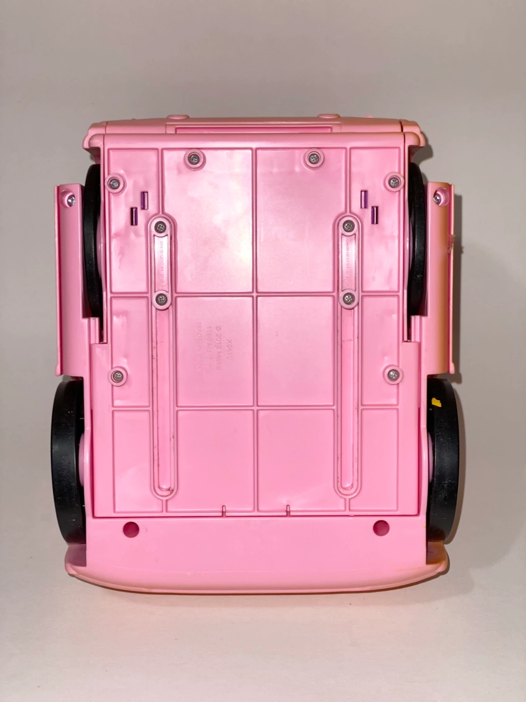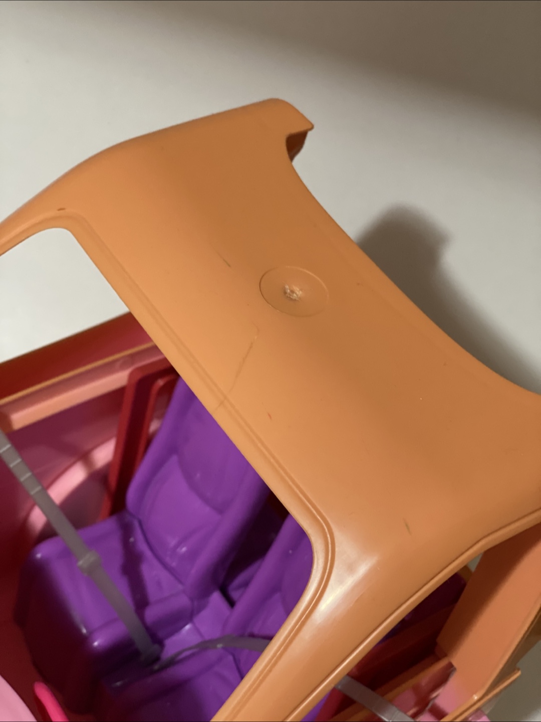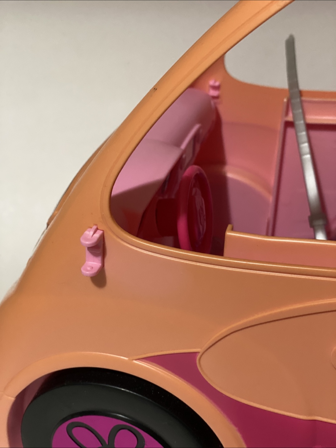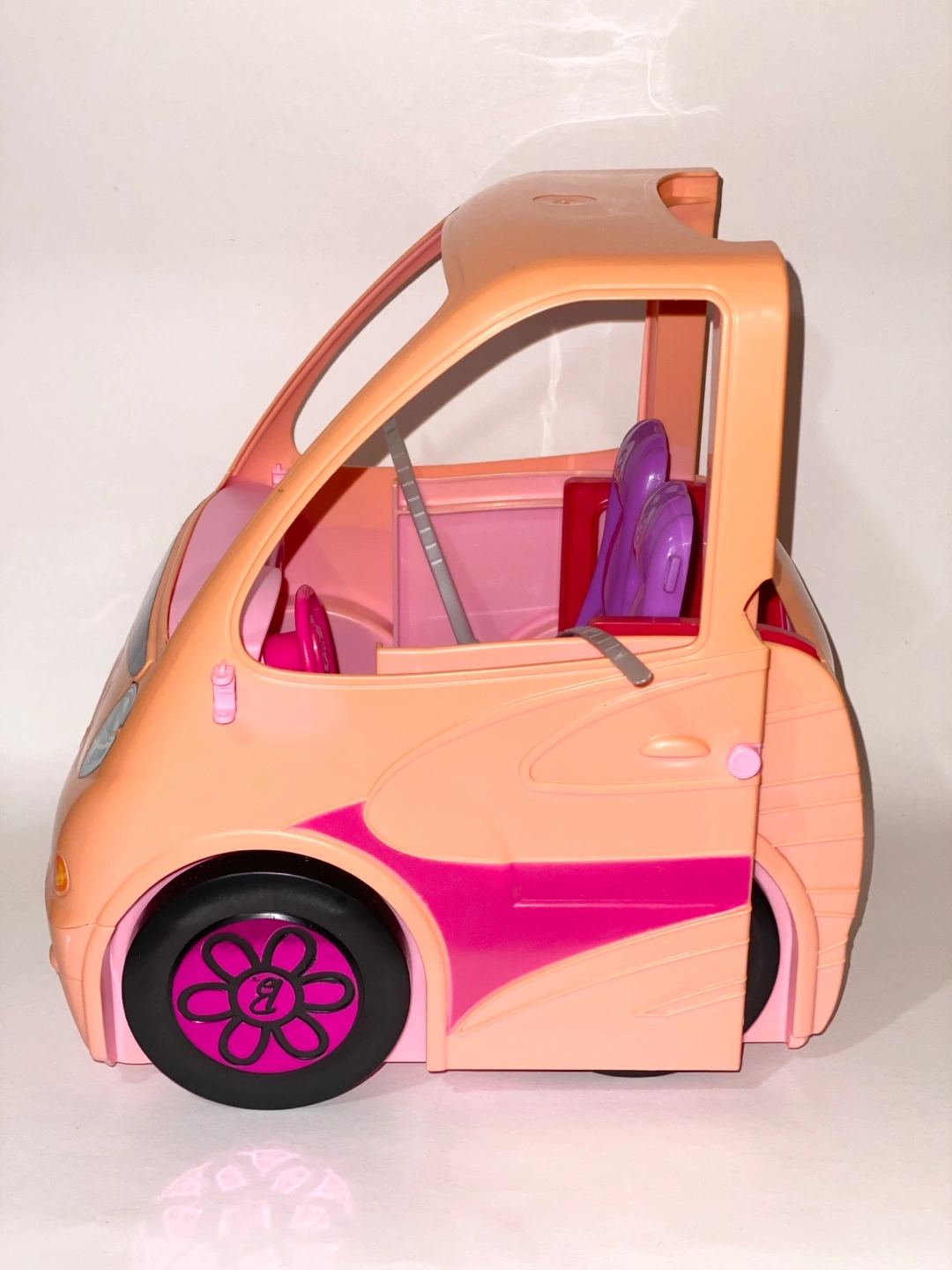 Selling a Barbie camper for parts only. It features purple seats and black wheels with the Barbie logo. Perfect for your Barbie dolls to cruise around in style.