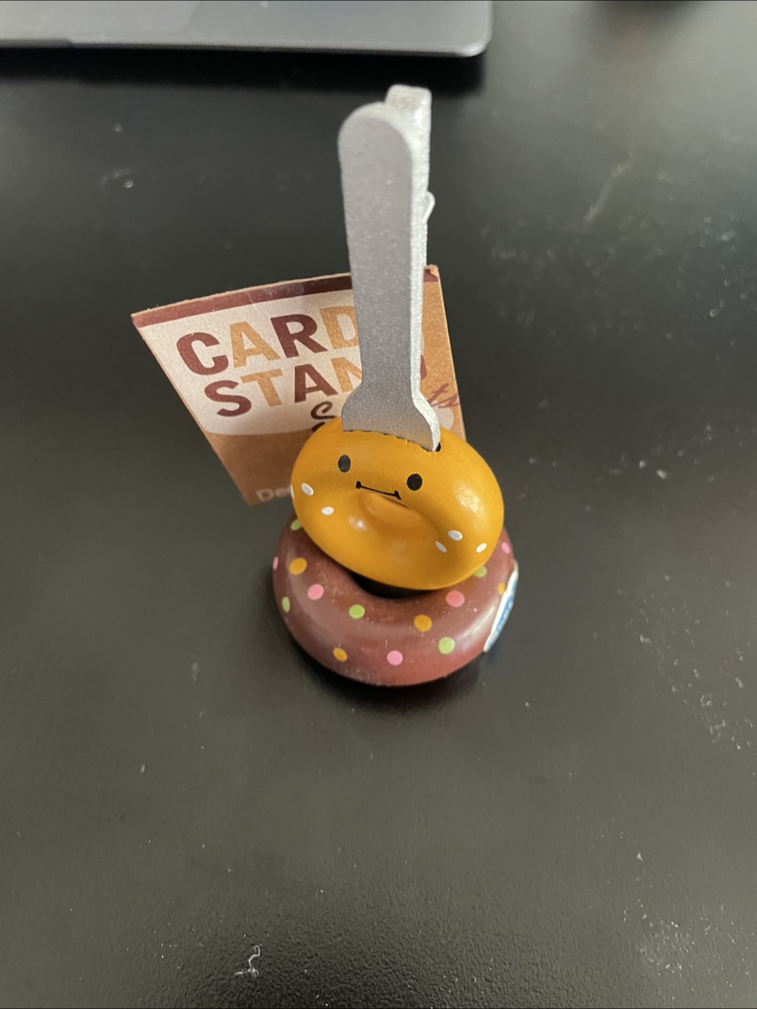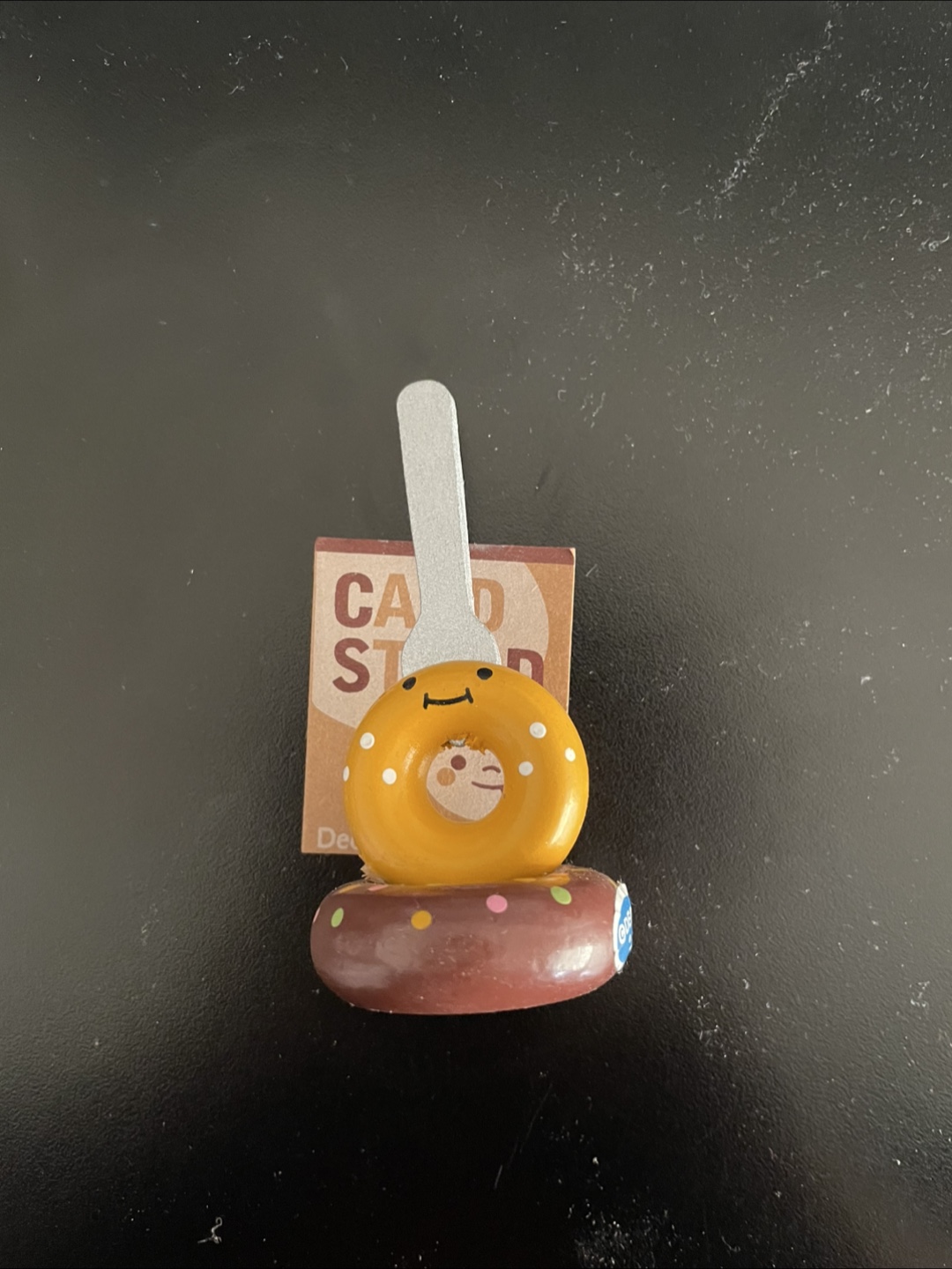 Selling a donut-themed card stand! It's perfect for holding business cards or displaying photos on your desk. The stand features a cheerful donut design with a little face, adding a touch of whimsy to any space
