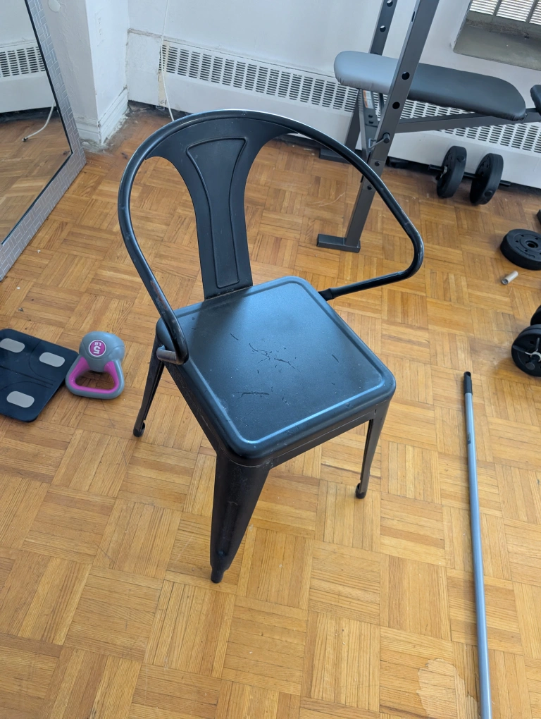 Selling a black metal chair with an industrial style. It's sturdy and would look great in a kitchen or as an accent piece! There are some minor signs of wear.