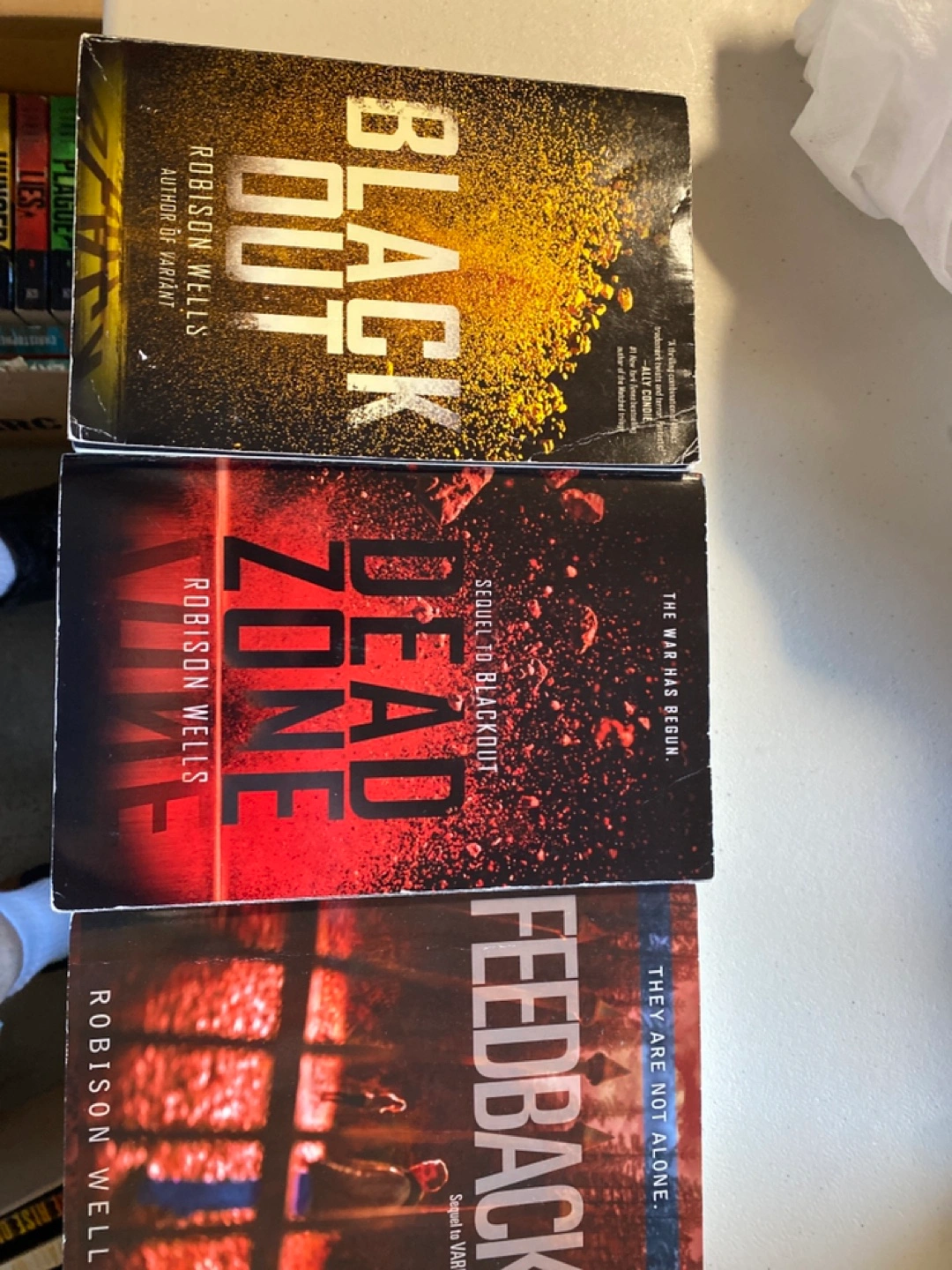 111Selling a set of three books by Robison Wells: Blackout, Dead Zone (sequel to Blackout), and Feedback (sequel to Variant) They are in good condition and ready for a new home!