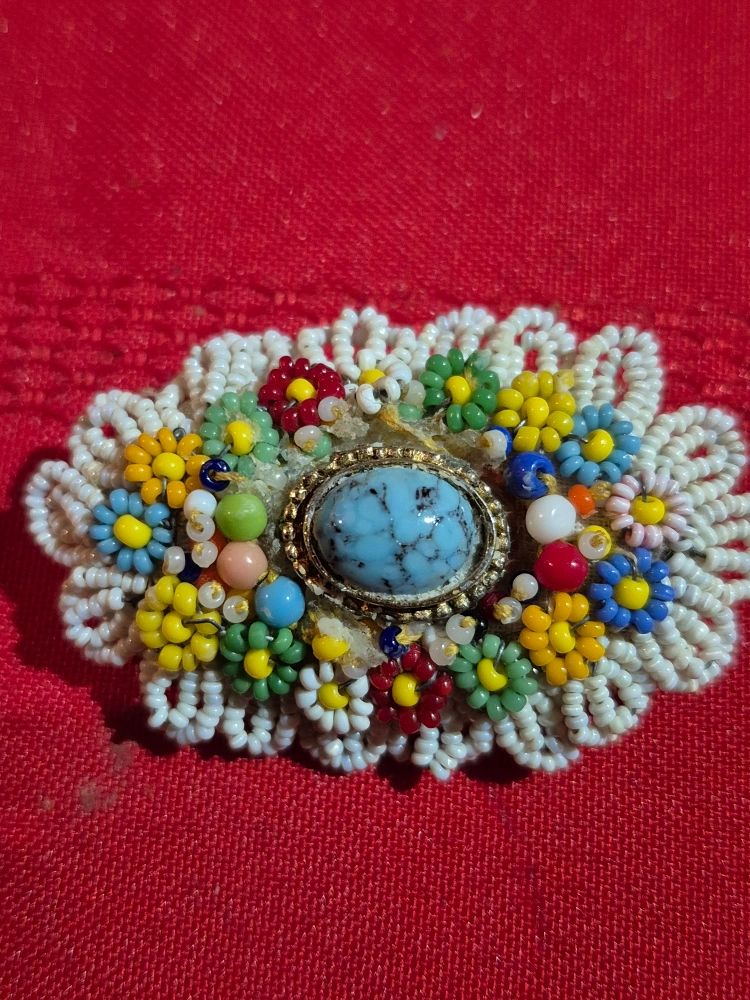 This is a lovely vintage brooch featuring a floral design made with colourful beads and a central turquoise stone. It's a unique piece that would add a touch of charm to any outfit!