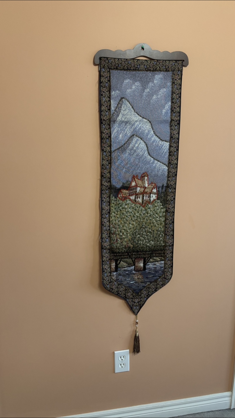 Selling a decorative wall tapestry featuring a picturesque scene of mountains, a house, and a bridge over water. It's in good condition and adds a cozy touch to any room!