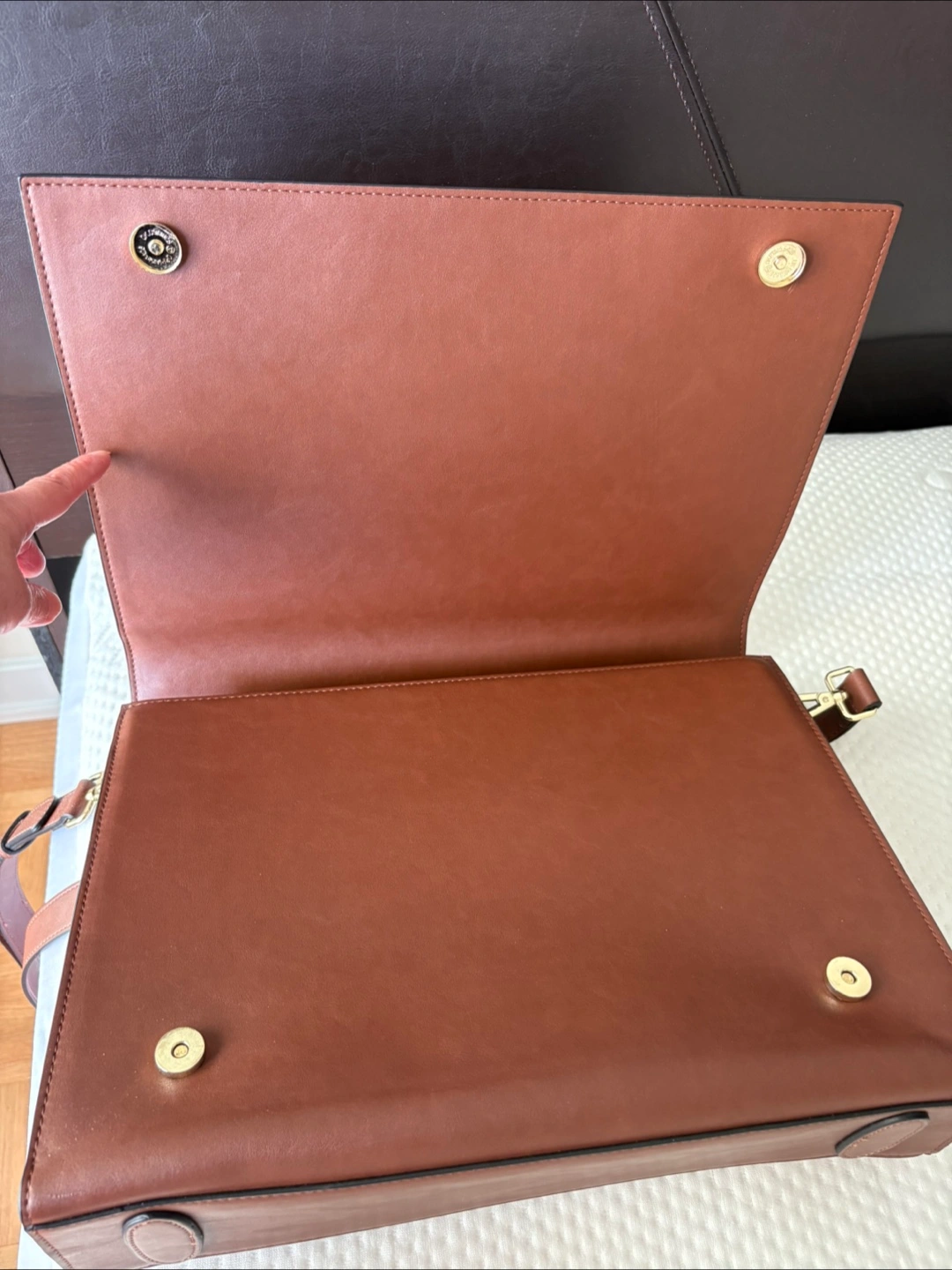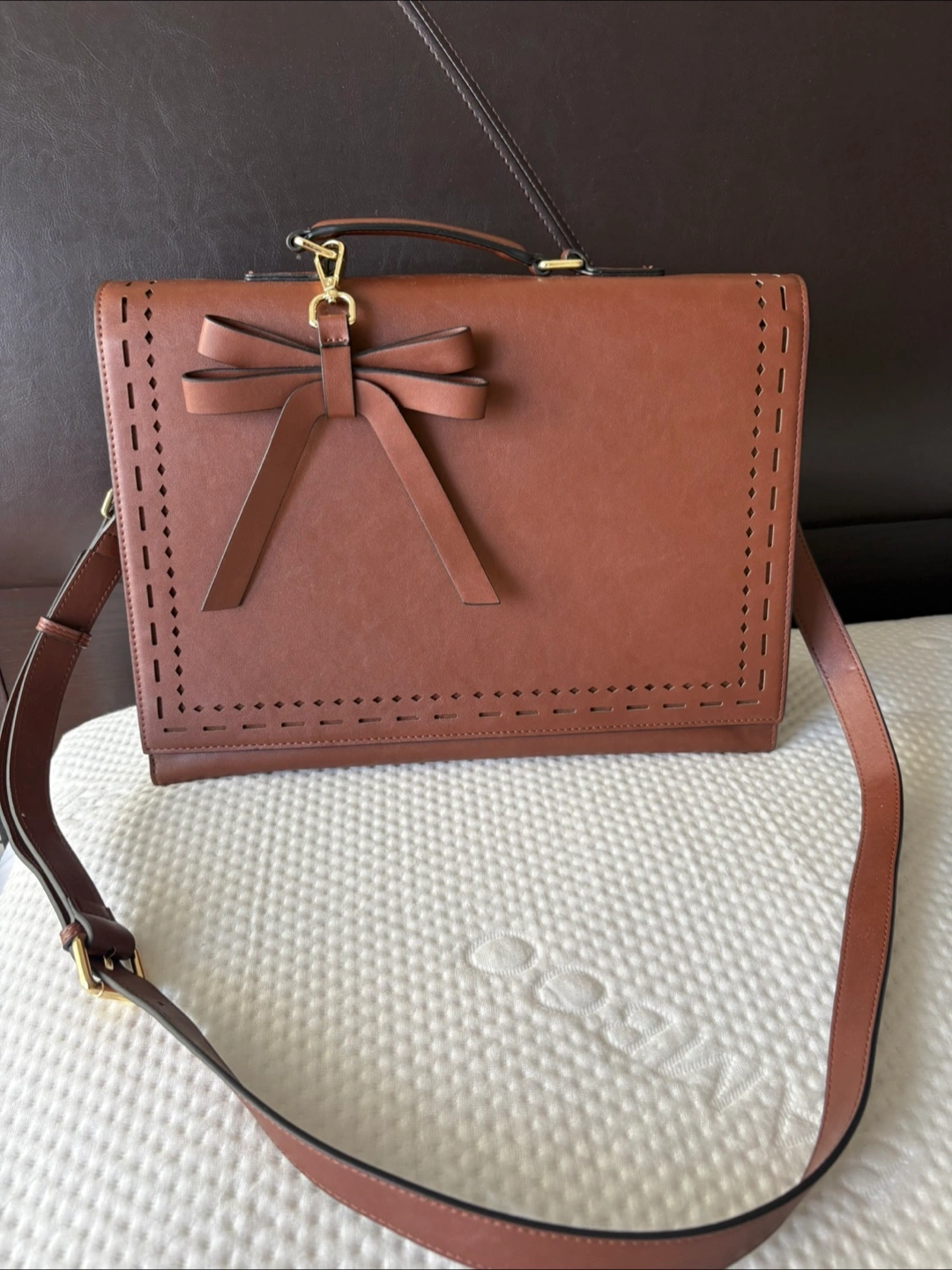 Here's a stylish tan briefcase with a cute bow accent (which is removable). It's perfect for carrying your laptop and other essentials. The bag features a shoulder strap and a top handle for easy carrying. It has multiple compartments inside to keep things organized.