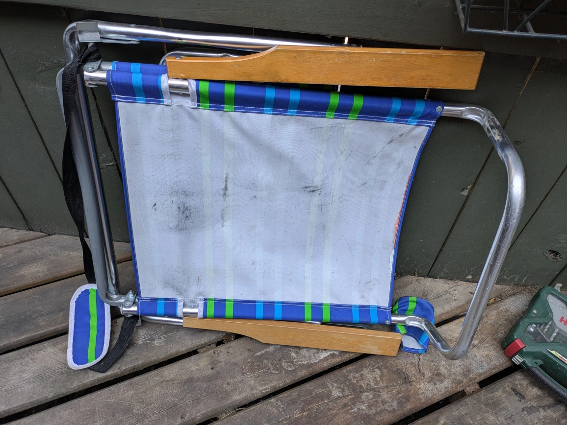 Selling a gently used Outbound beach chair. It features a vibrant blue and green striped pattern and wooden armrests. Perfect for relaxing at the beach or in your backyard!