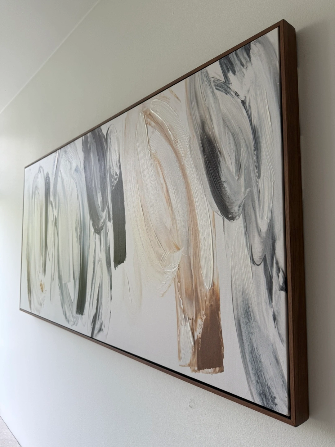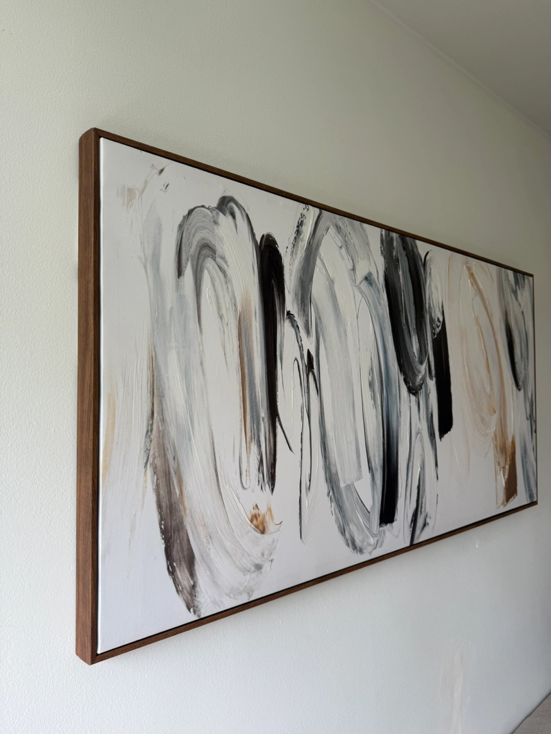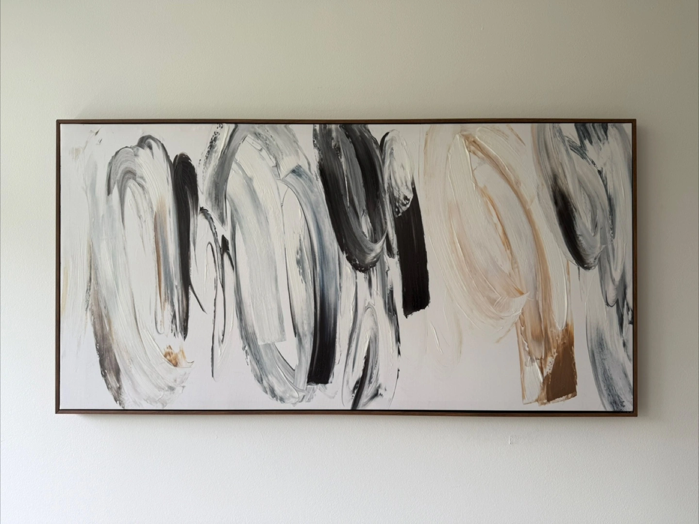 Selling a beautiful piece of abstract wall art. It features a modern design with neutral tones of black, white, and brown. The painting is framed in a dark wood, adding a touch of sophistication to any room. Perfect for adding a stylish touch to your home decor