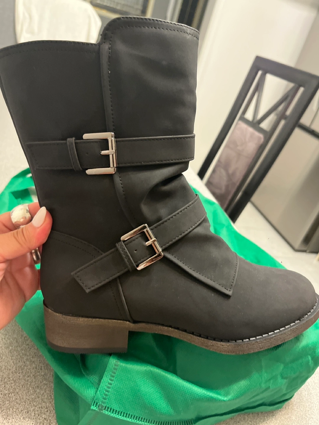 Selling a pair of Vellucci black boots in size 7.5. They have a stylish design with buckle details. Great for adding a bit of edge to any outfit!