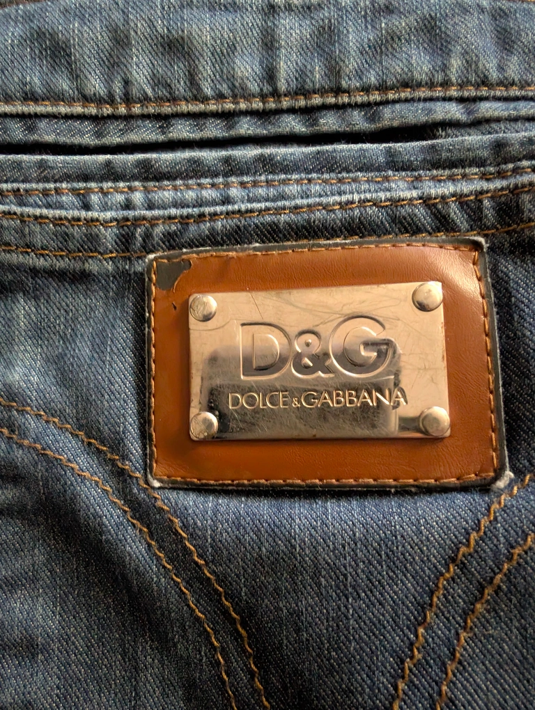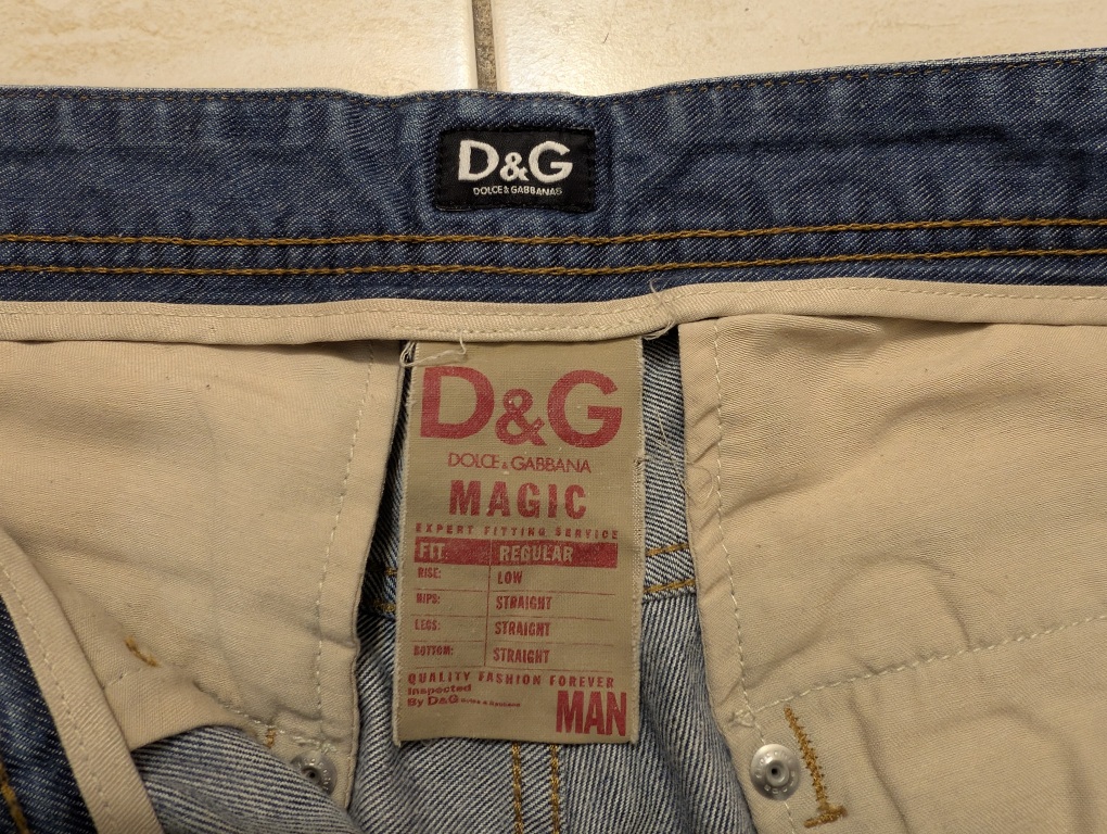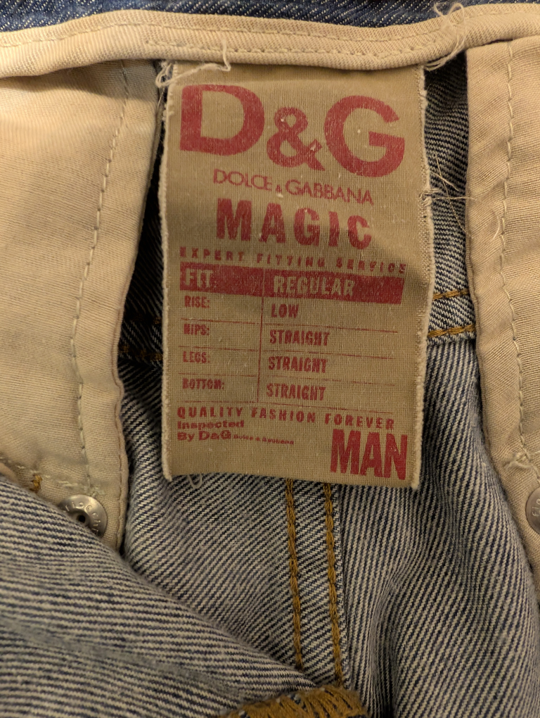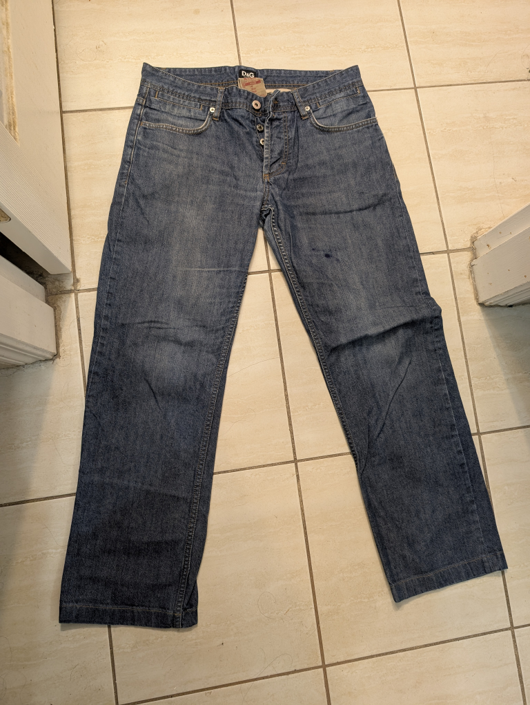 Selling a pair of D&G Dolce & Gabbana jeans. These are the 'Magic' fit, with a low rise and straight legs. 34" x 29 1/2" - They're in great shape and ready for a new home! On last pic, stain on front left thigh.