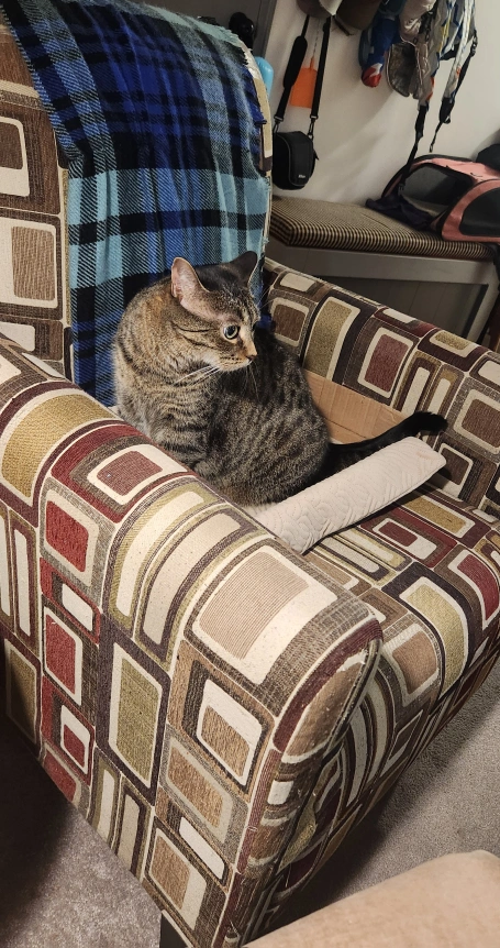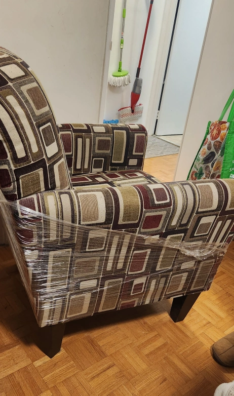 Armchair with a unique geometric pattern! It's in good condition and ready for a new home. The chair is wrapped in plastic for protection during transport. Coming from a home with a cat, she is not included. There are pick marks from her as she is not declawed. They're selling in AS IS conditon and are comfortable to sit in. These were more for decorations then they were used for sitting. the price is FIRM. $60 each