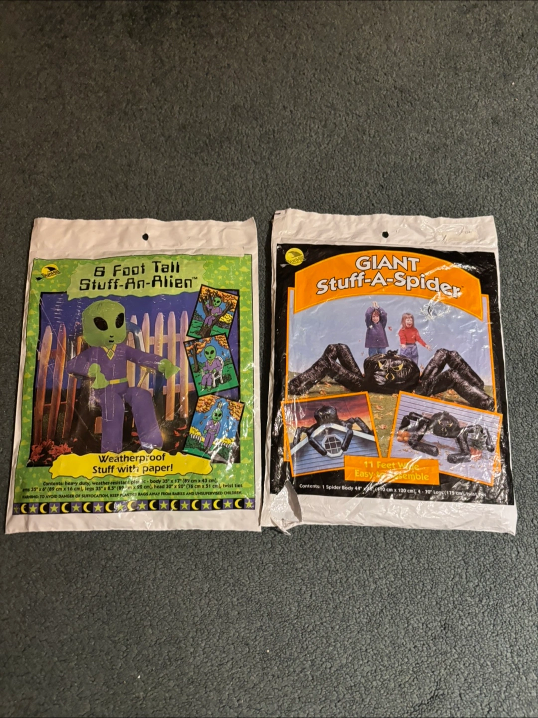 Two bran new never opened Halloween decorations. Comes with a 5 foot tall stuff-an-alien and a stuff-a-spider. Packaging shows some wear. Made by sunhill. Price is for both