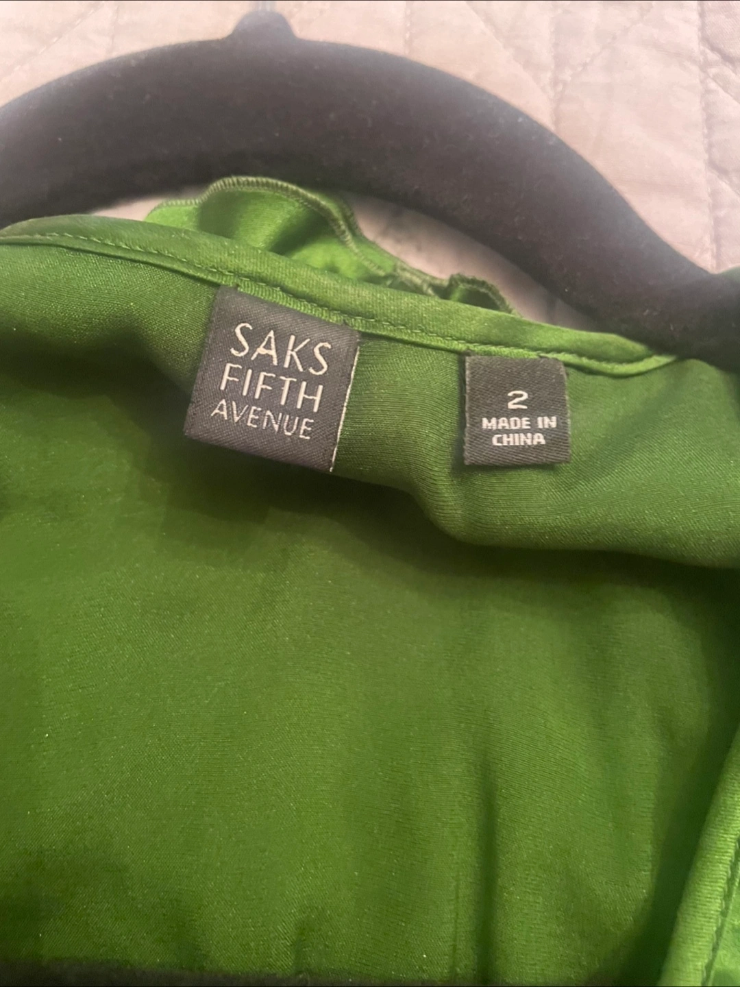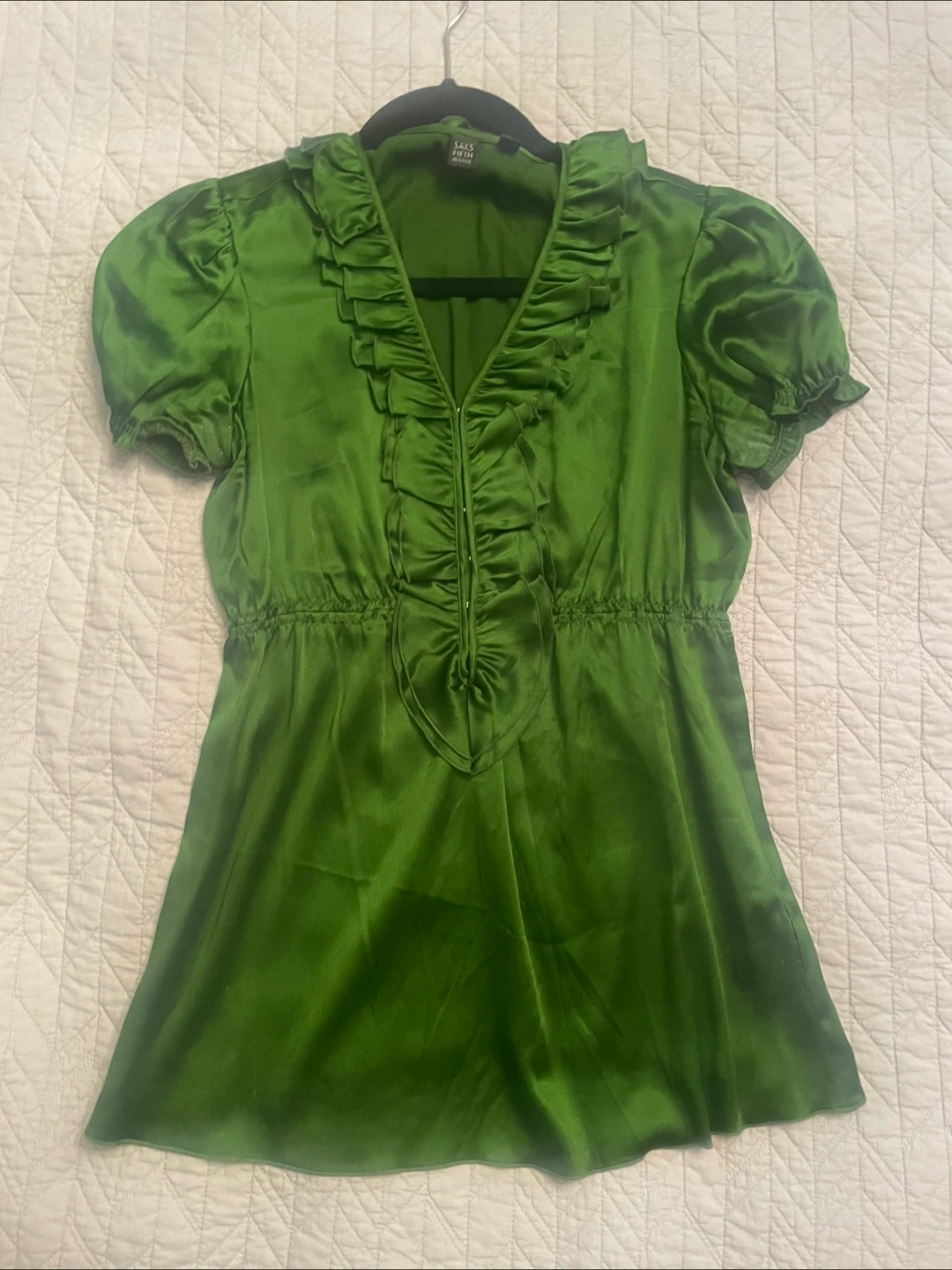 28Selling a vibrant green blouse from Saks Fifth Avenue! It's a size 2 and features a ruffled V-neck design with short, puffed sleeves. The material has a lovely sheen, making it perfect for dressing up or down. A stylish addition to any wardrobe!