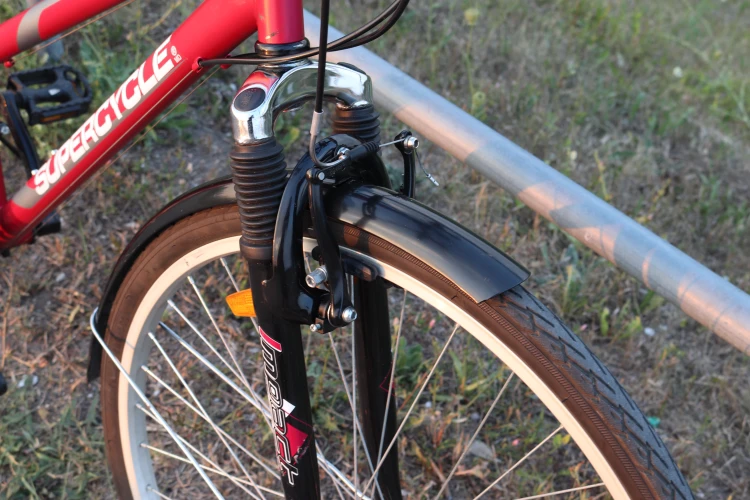 It has a suspension fork and spring seat for a comfortable ride. It has fenders for riding in any weather, rain or shine.