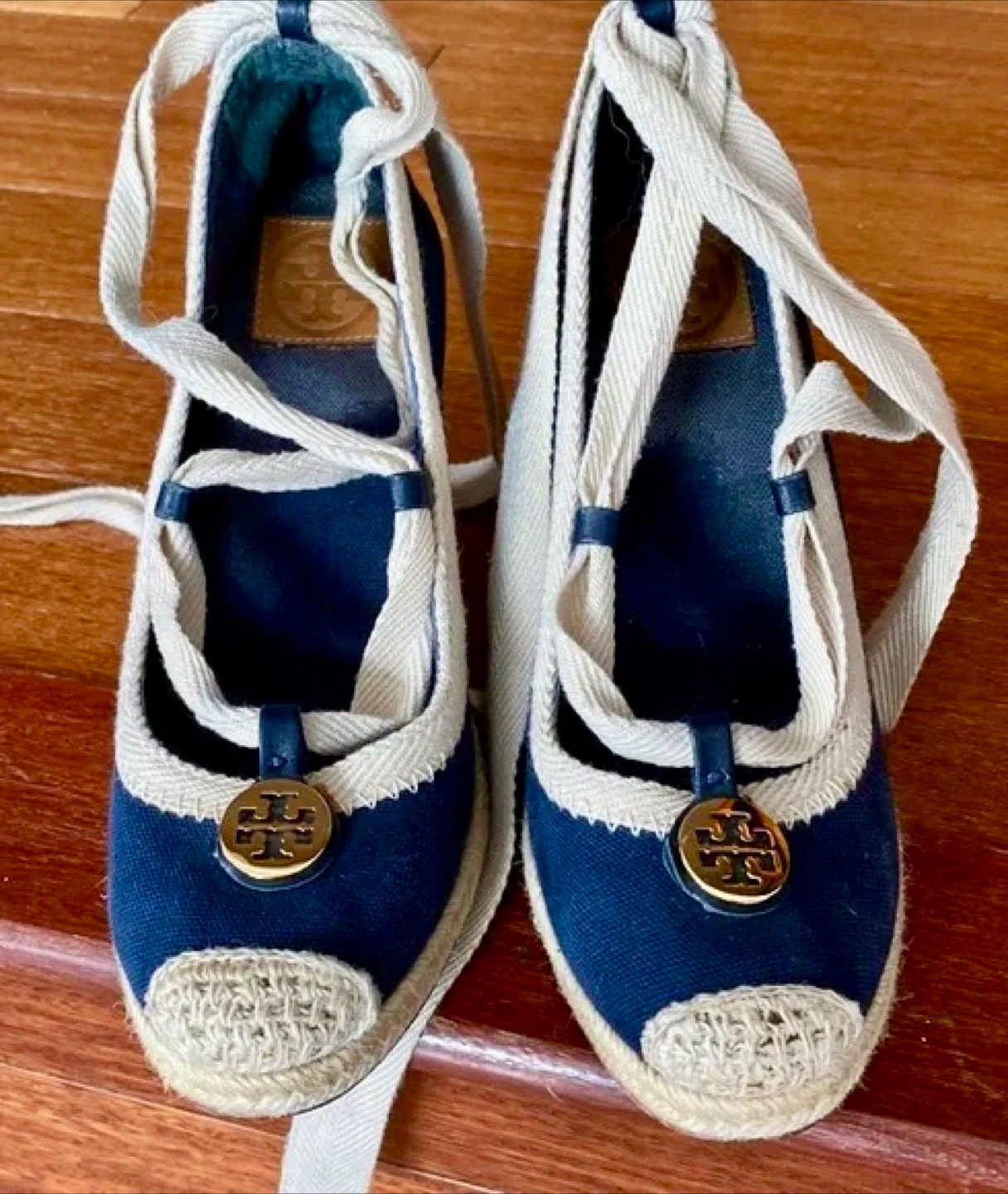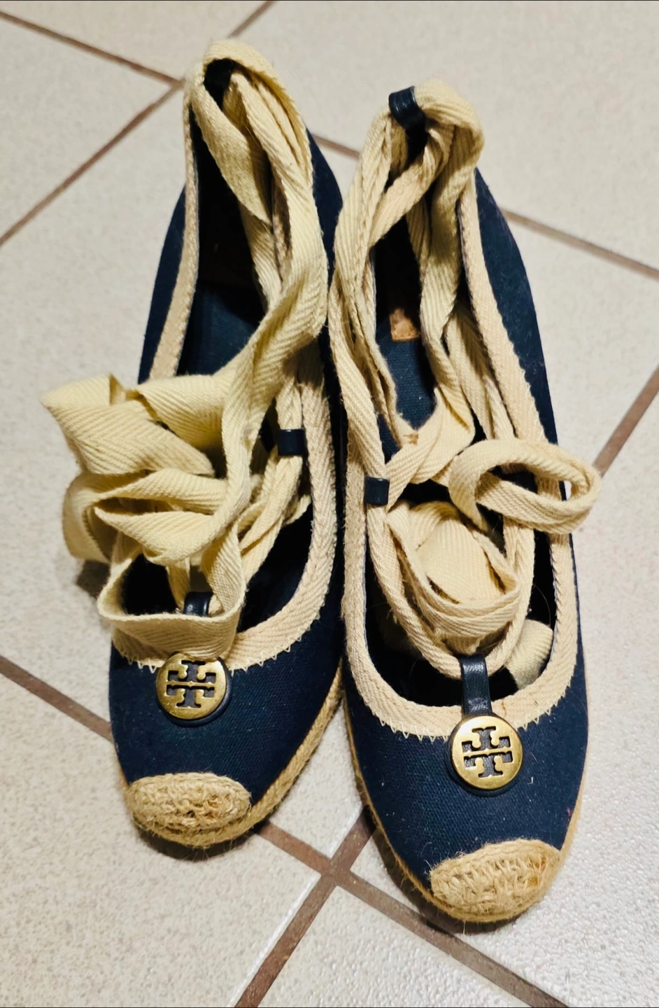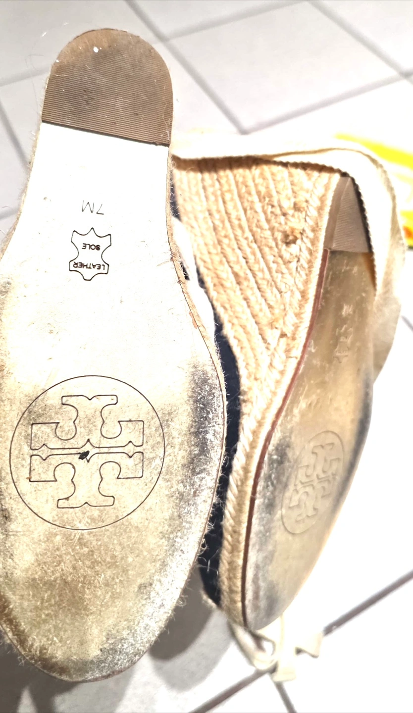 Selling a pair of authentic Tory Burch espadrille wedges in great condition! These feature a navy blue canvas upper with a jute wedge heel and ribbon tie ankle straps. They're perfect for adding a touch of style to any outfit!