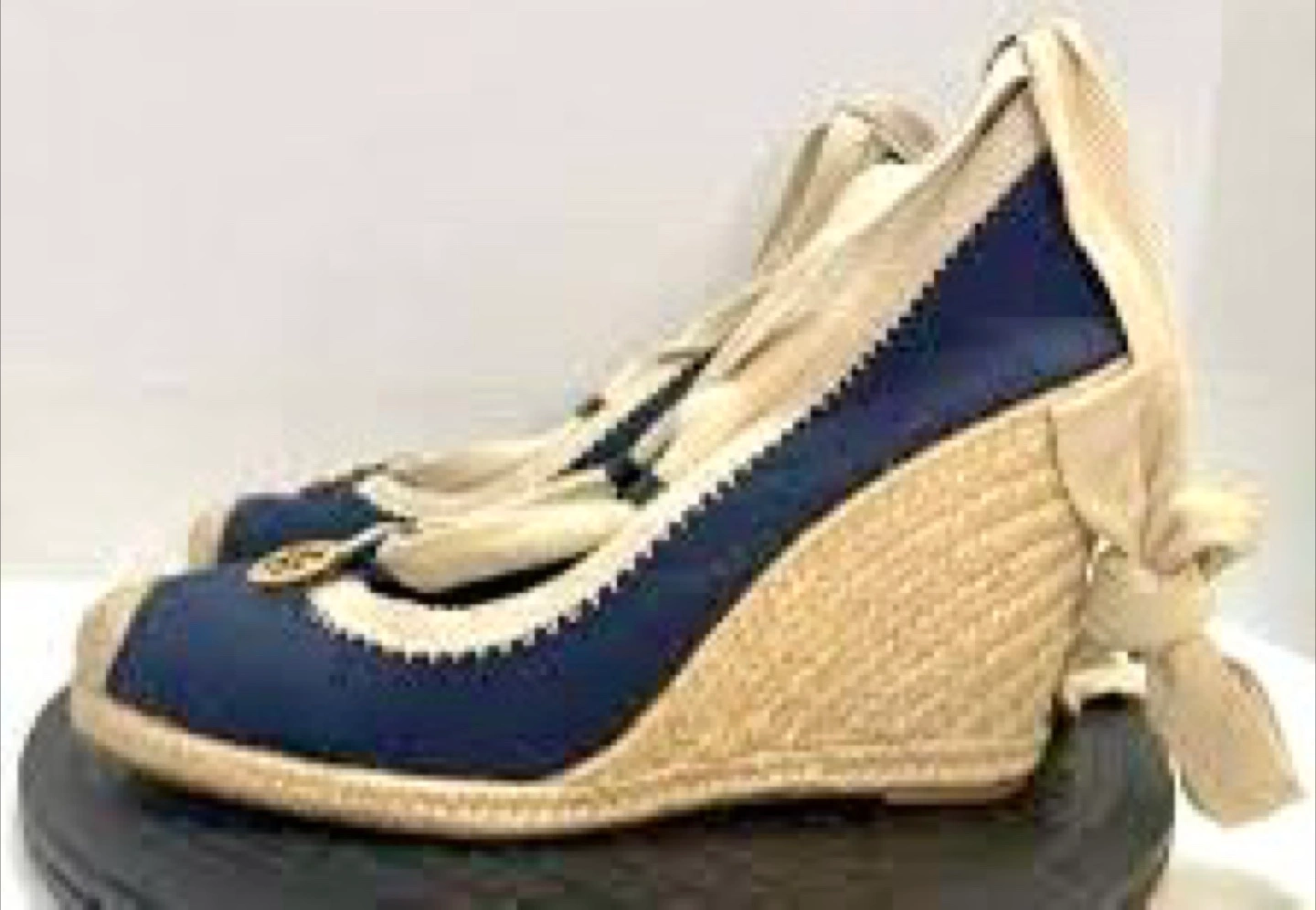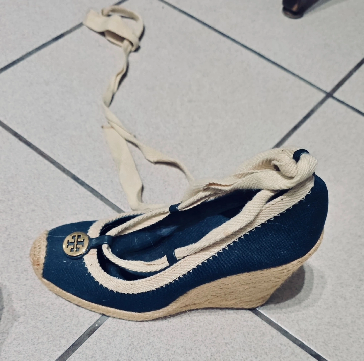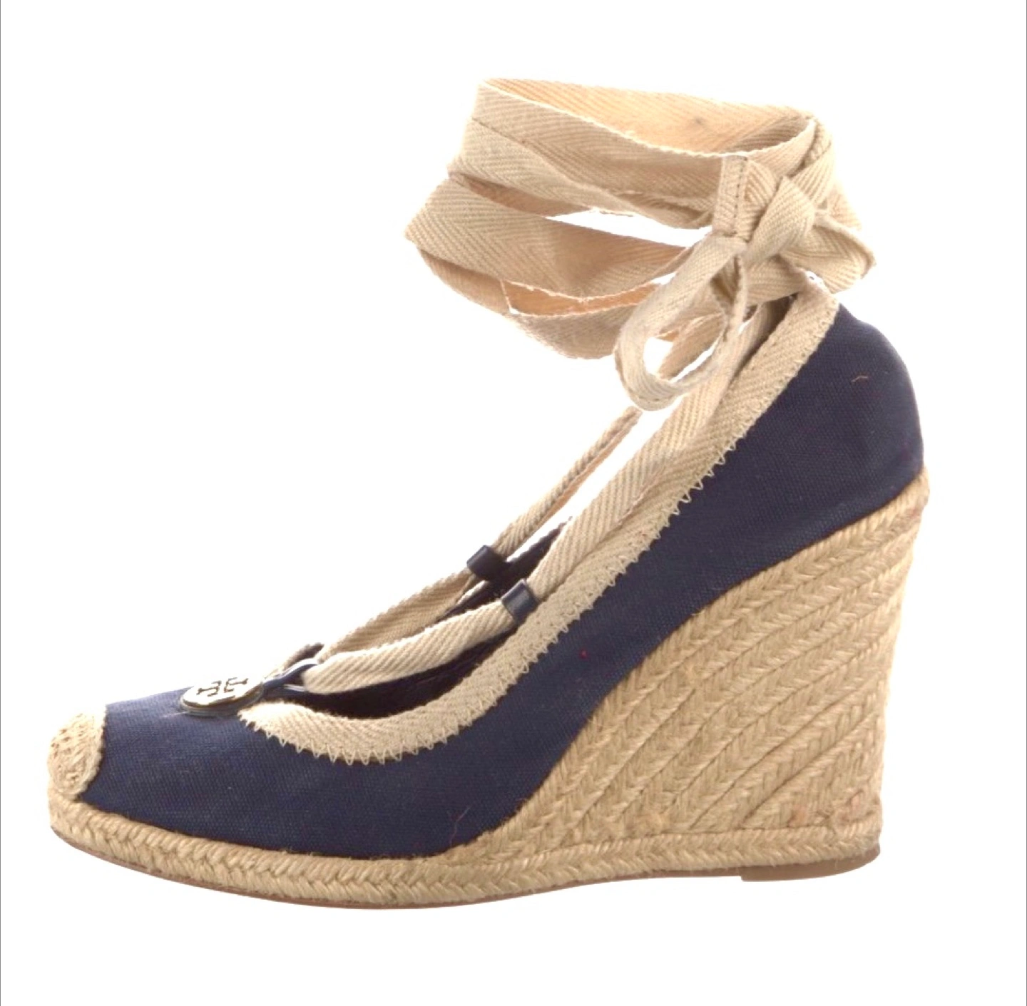 Selling a pair of authentic Tory Burch espadrille wedges in great condition! These feature a navy blue canvas upper with a jute wedge heel and ribbon tie ankle straps. They're perfect for adding a touch of style to any outfit!