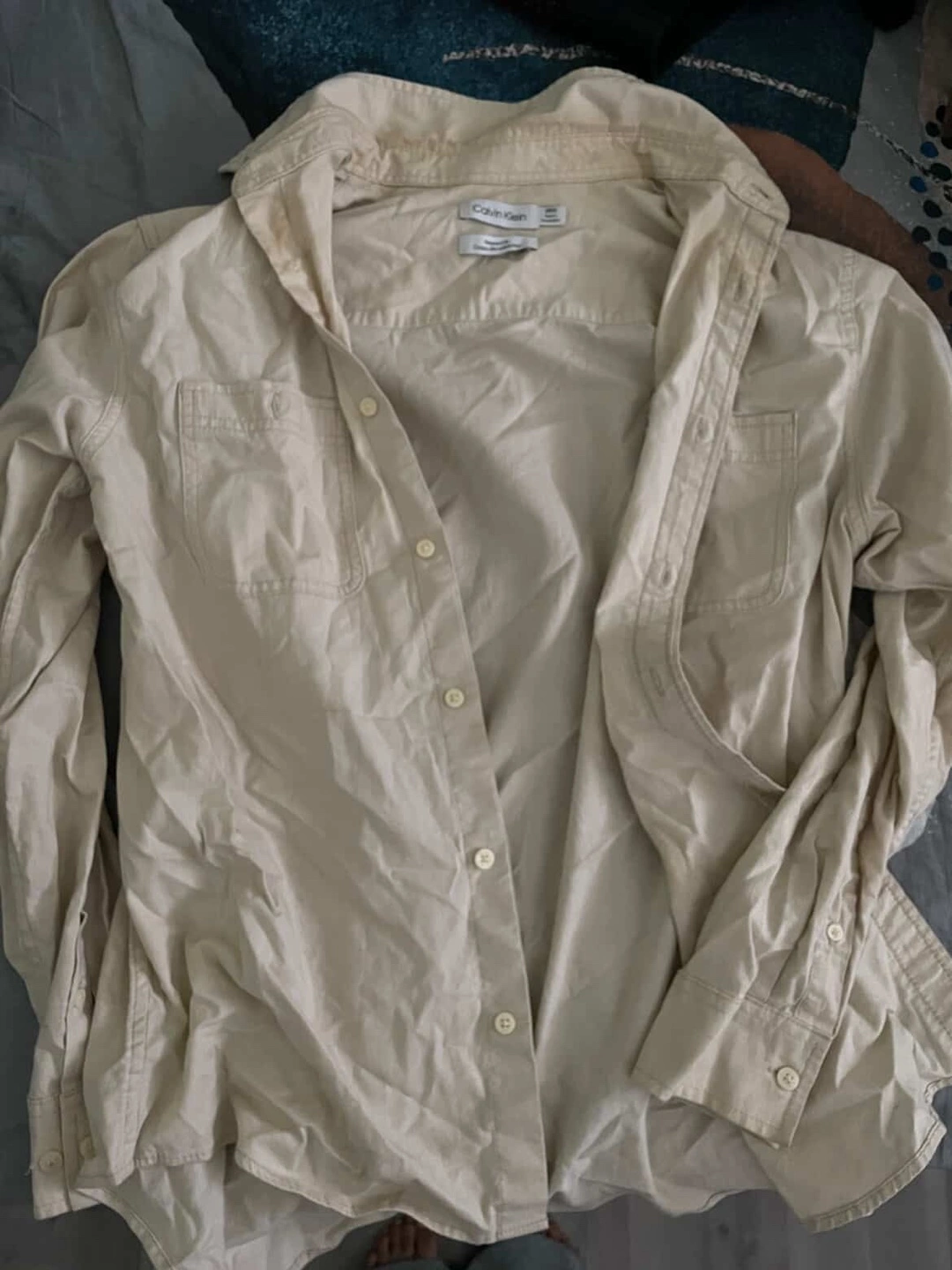 Selling a beige button-up shirt from Calvin Klein. It has a couple of pockets on the chest and is in worn condition.