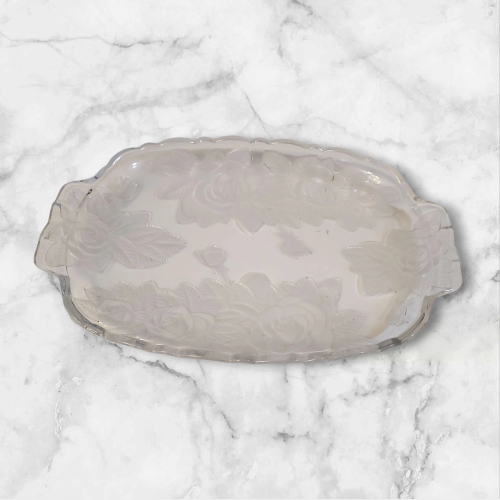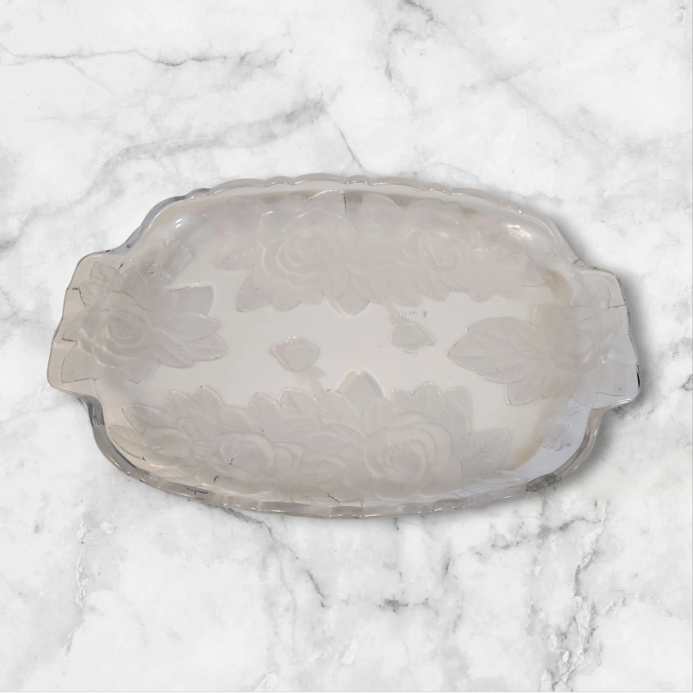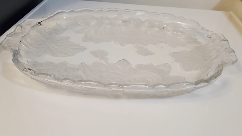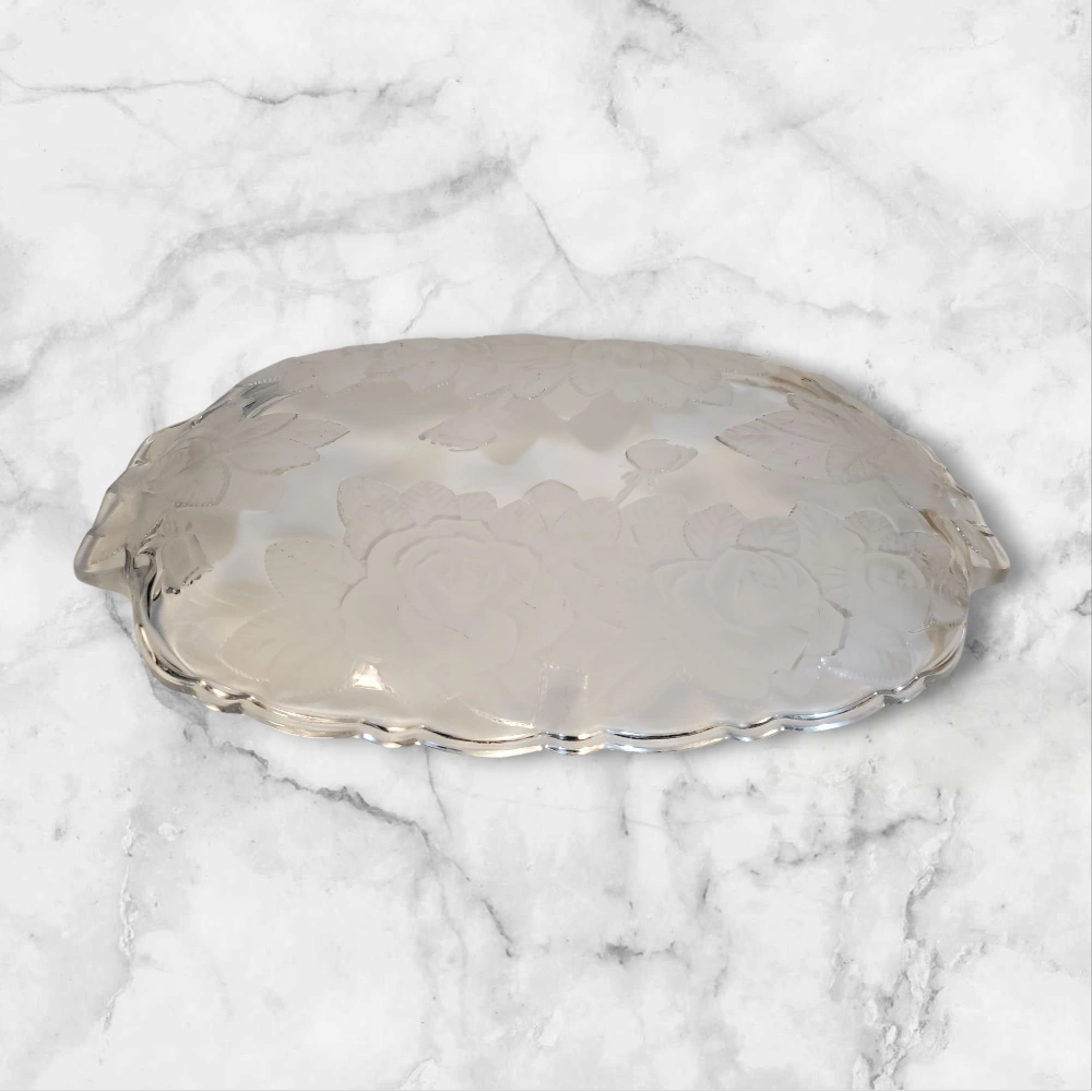 Frosted glass serving platter. It features a beautiful rose design etched into the glass. Perfect for serving appetizers or desserts at your next gathering!