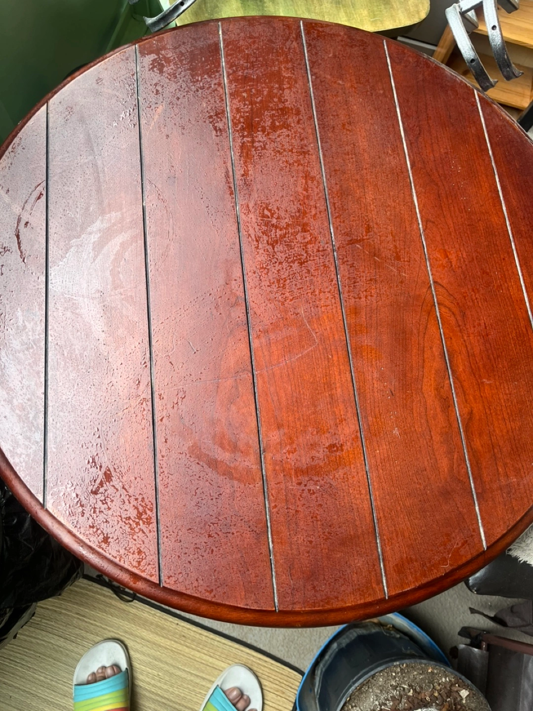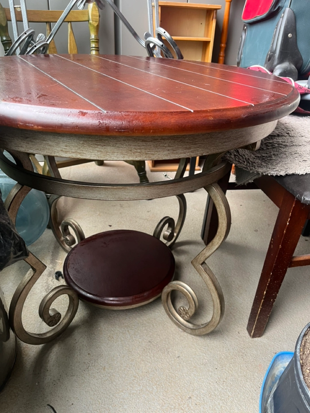 Selling a round wood dining table. It has a unique metal base with decorative swirls. The top is made of wood with a warm finish. It has some signs of use.
