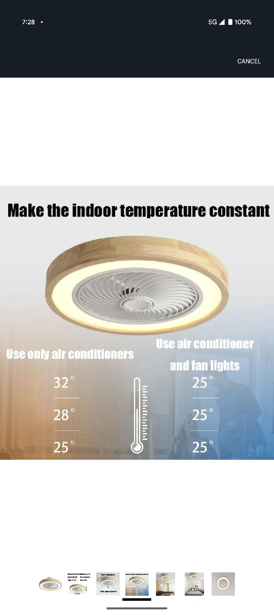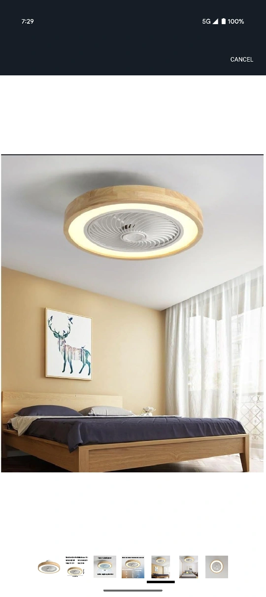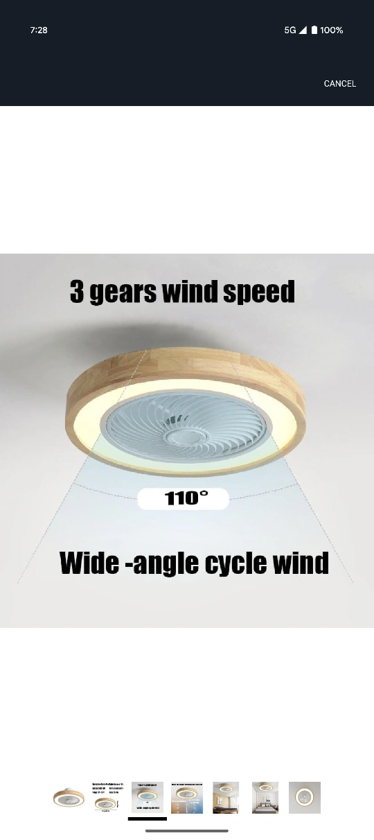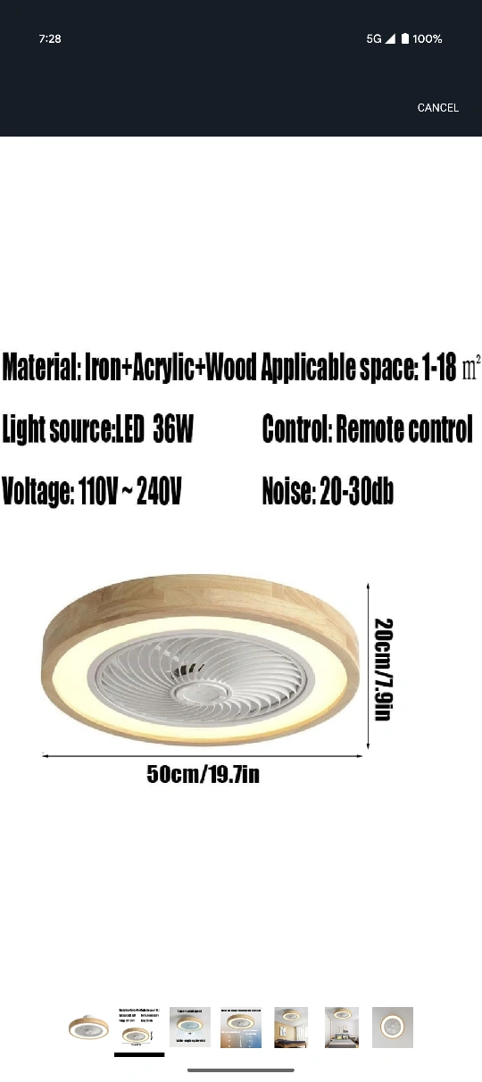 This LED ceiling fan light is perfect for spaces between 1-18 square meters! It features a remote control, LED 36W light source, and operates at 110V-240V. The noise level is between 20-30db. It's made of Iron, Acrylic, and Wood, and measures 50cm/19.7in in diameter and 20cm/7.9in in height. It has 3 gears of wind speed and wide-angle cycle wind at 110 degrees!