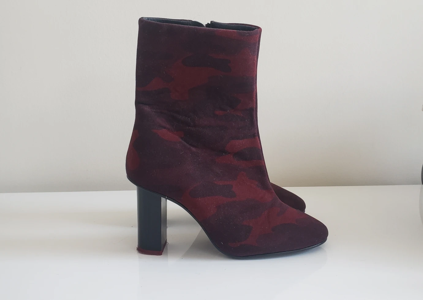 #heel #camo #burgundy #red #bootie #ankle #suede