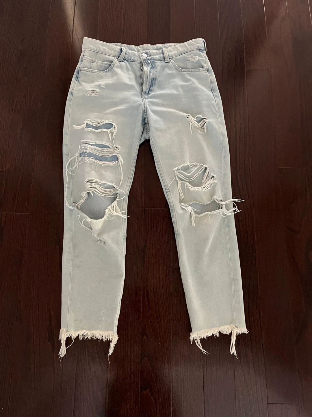 Selling a pair of light wash jeans with a distressed look! They have rips and frayed hems for a unique style. Perfect for a casual outfit! Boyfriends cut