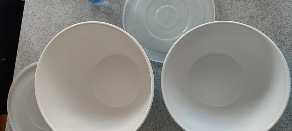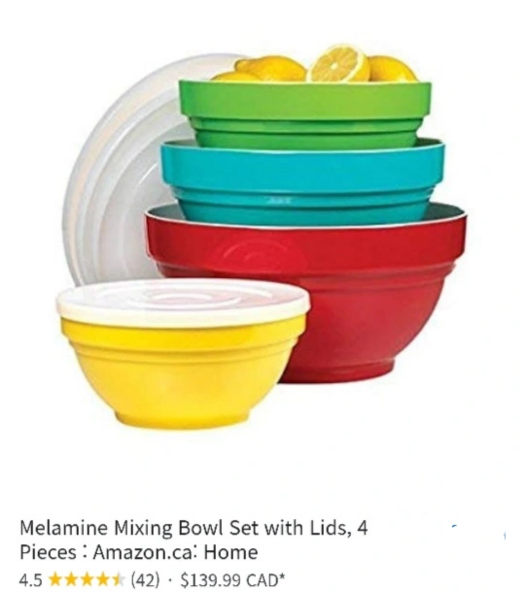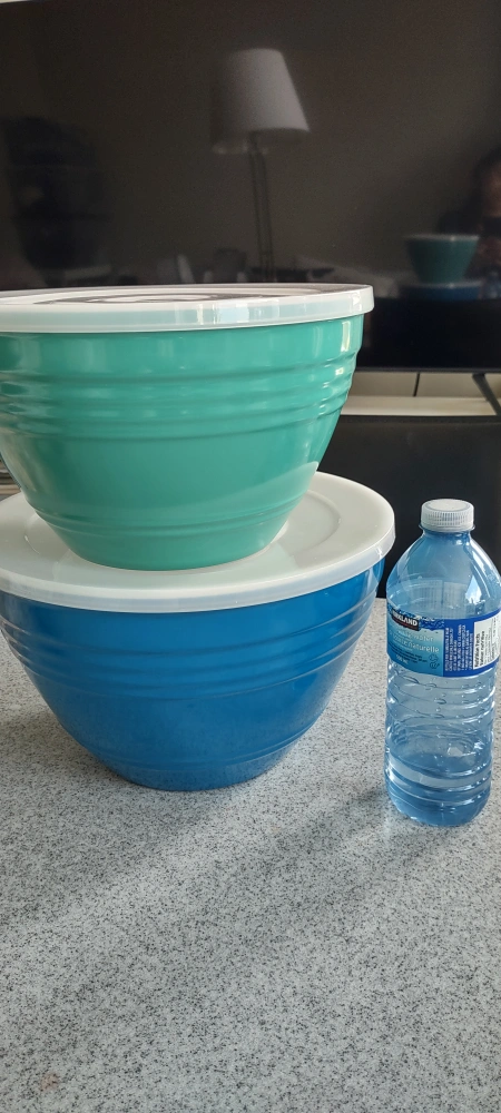I'm selling a set of two mixing bowls with lids. One is a lovely teal colour and the other is a nice blue colour. They are made of melamine.