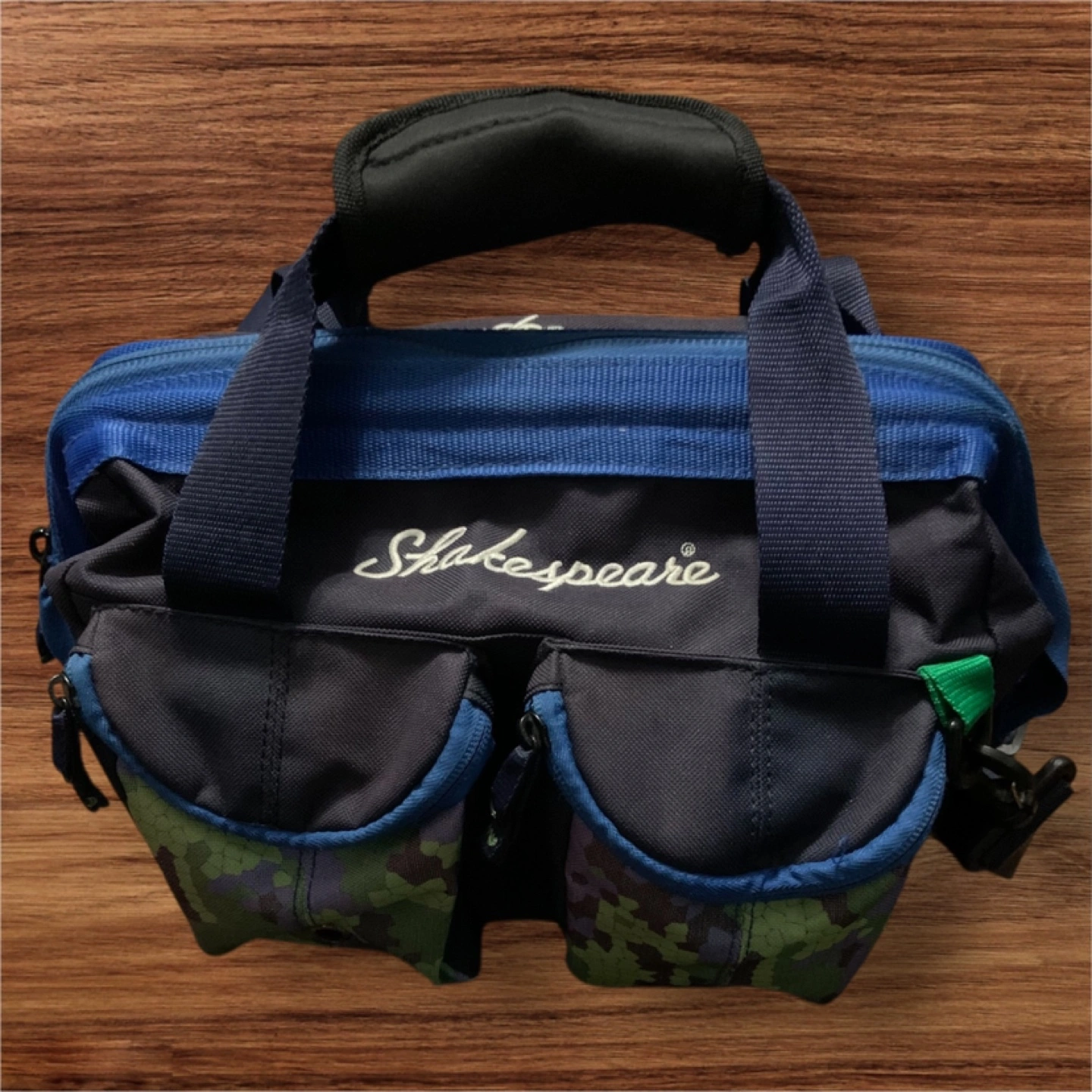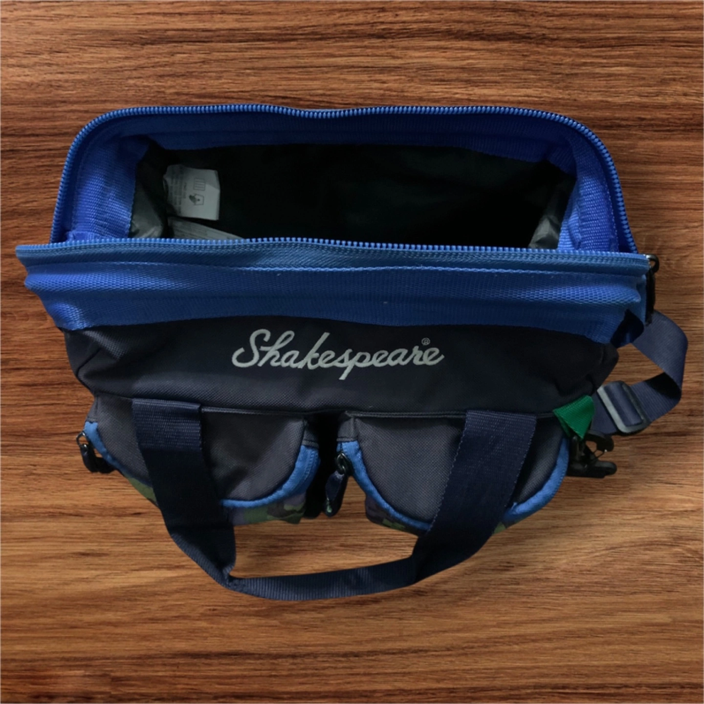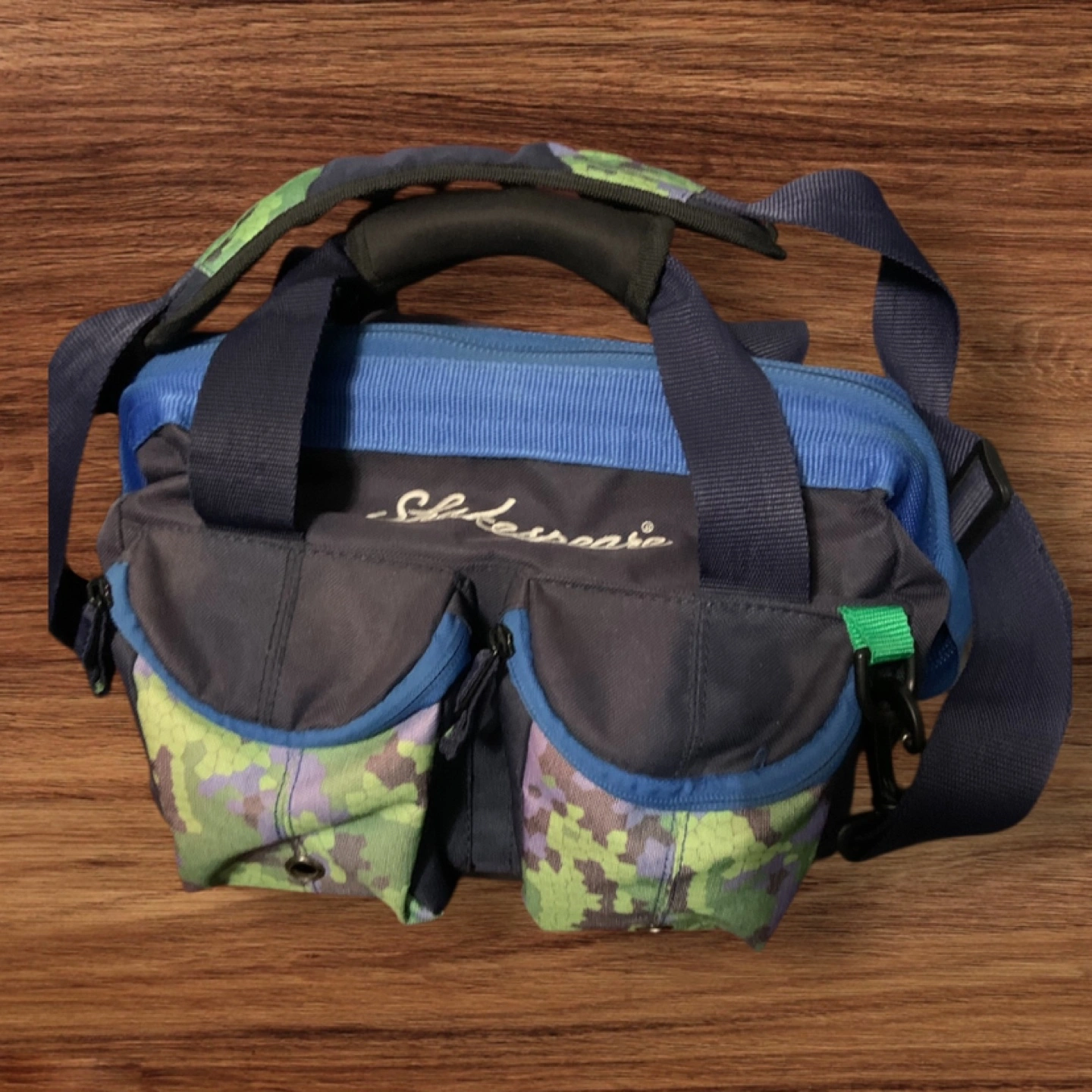 Shakespeare fishing tackle sling pack bag It's got a good amount of space for all your fishing gear. Perfect for keeping everything organized and easy to carry on your next fishing trip. Good used condition. Approx. Size : 12” L x 10” W x 9” H (pockets not included in size approximation.)