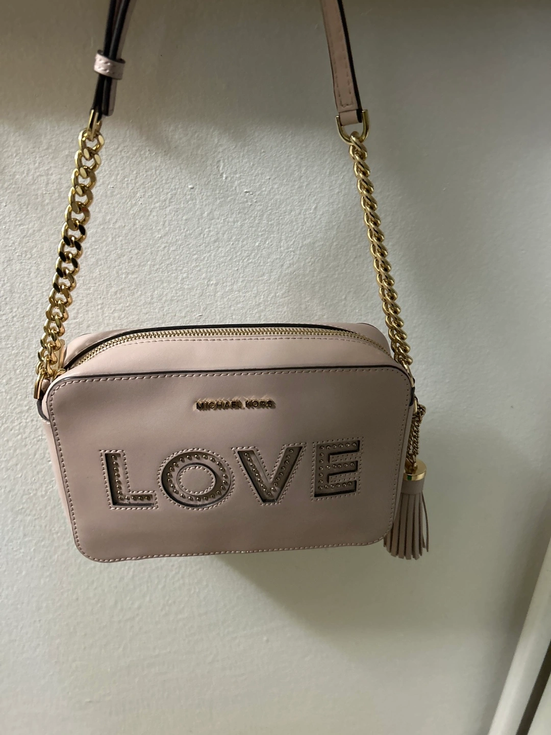 Selling a cute Michael Kors crossbody bag! It's in great condition and features the word 'LOVE' on the front. Perfect for everyday use or a night out. The bag has a gold chain strap and a tassel detail. Feel free to ask any questions!