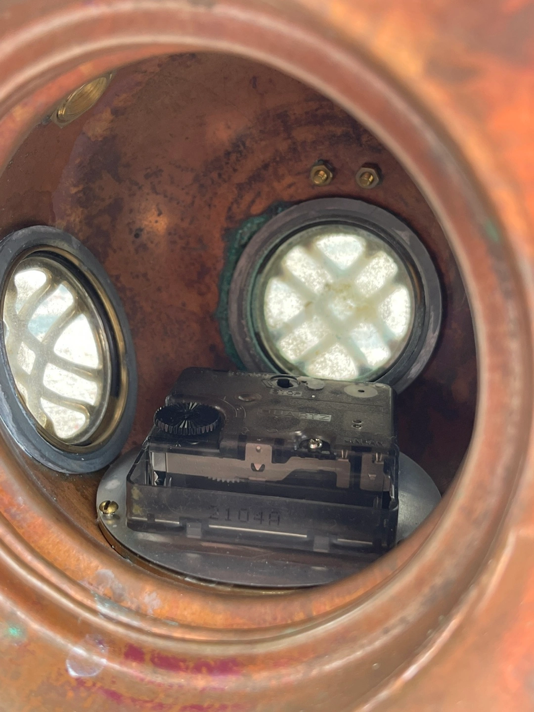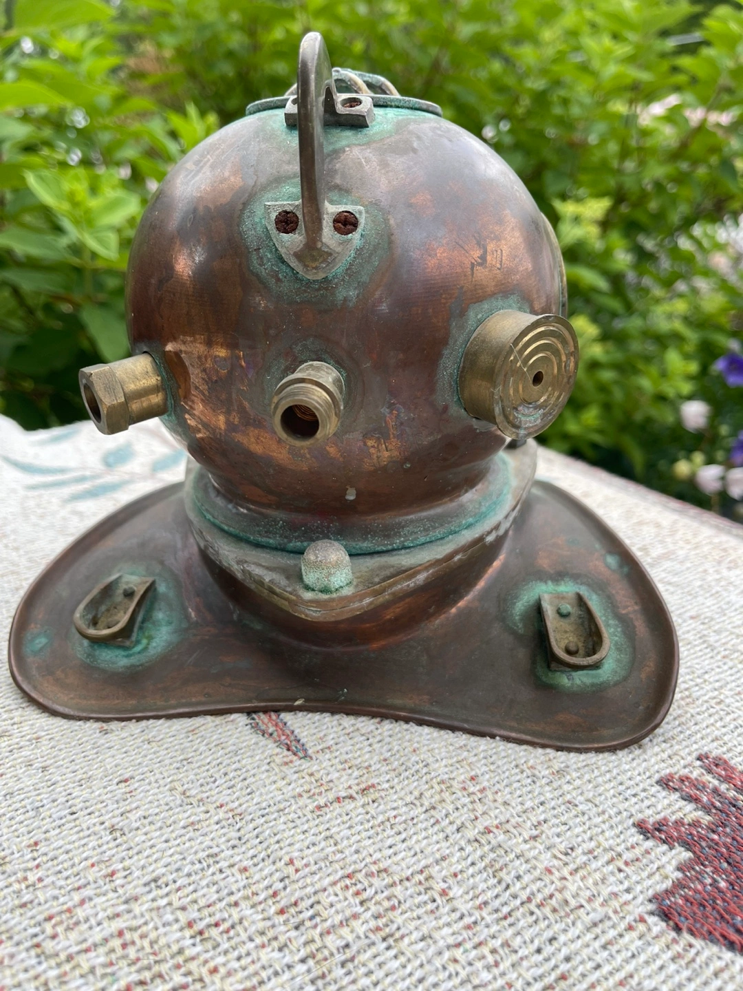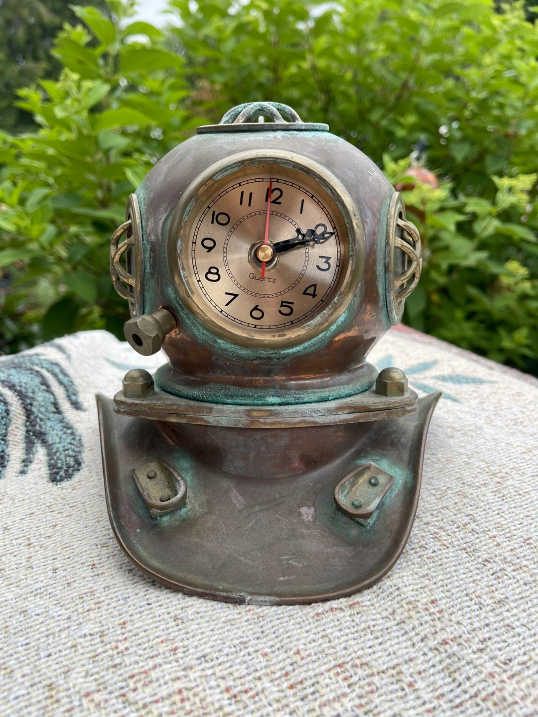 This is a unique diving helmet clock, perfect for adding a nautical touch to your home decor! It has a cool, vintage look with a weathered finish, giving it a lot of character